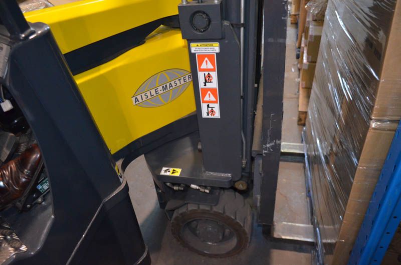 The Aisle-Master Very Narrow Aisle (VNA) forklift bears uncanny resemblance to a tractor when you first see it. It’s longer than you’d expect, due mostly to need for the articulated forks’ wheelbase to swing 90 degrees and beyond.
