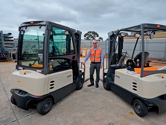 Sales general manager Jeff Marshall and communications manager Nigel Tunnell-Jones join me in gazing across the swath of forklifts sitting patiently in neat rows, awaiting their call to action.