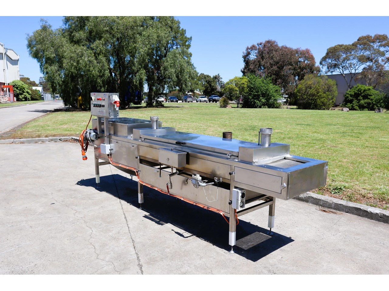 Stainless steel continuous steam pasteuriser for pasta by A. Cozzi (Italy). Provides thermal pasteurisation of fresh pasta products using steam. The machine features a mesh conveyor belt running through an enclosed tunnel, where water in a shallow reservoir is heated by a gas fired system. This was supplied in Australia by MEC Australia, and is built for continuous operation.