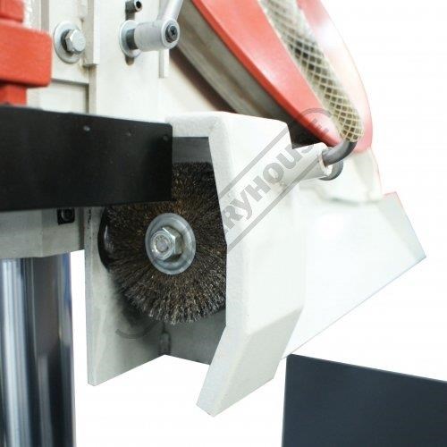 Synchronised power driven blade cleaning brush removes swarf from blade