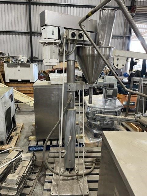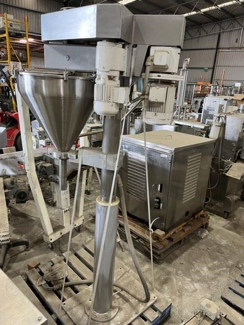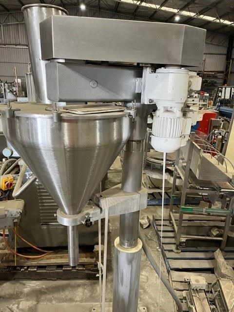 Stainless steel filler. Last used to fill Cans of powdered baby powder. 30kg hopper, requires a 45 mm dia screw. Complete with agitator to make sure clumps dont form while filling. Requires electrical controls. 415 volt 3 phase.