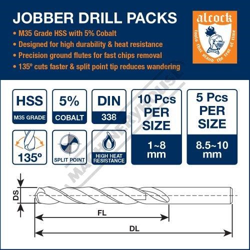 Alcock Drill Bits are manufactured to DIN 338 standards from M35 HSS with 5% cobalt for outstanding durability, heat resistance, and drilling performance. Precision-ground flutes ensure fast chip removal, while the 135° split-point tip cuts quickly, self-centres, and reduces wandering-perfect for tougher steels.