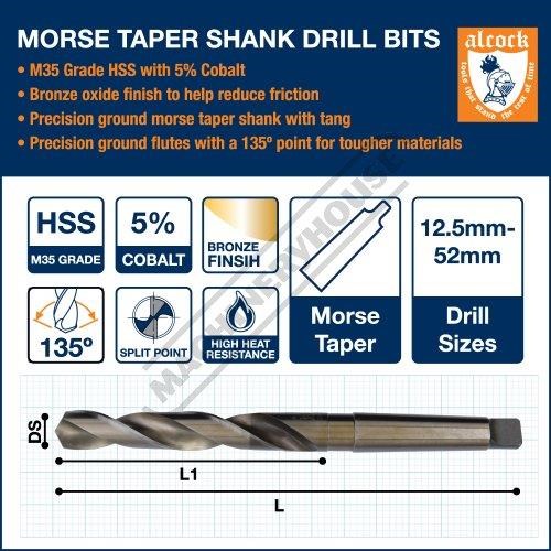 Alcock drill bits are manufactured from M35 grade HSS including 5% cobalt, this high-grade material offers superior drilling performance and durability. Each drill bit features precision-ground flutes and a 135° cutting point angle, which is ideal for drilling in tougher materials while enhancing longevity and performance. The morse taper shank ensures positive driving for heavy duty drilling & is supplied with a tang for easy ejection making it an ideal choice for any workshop.