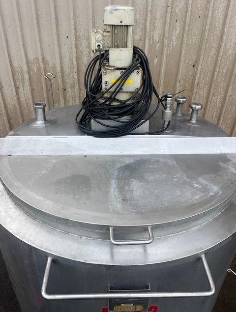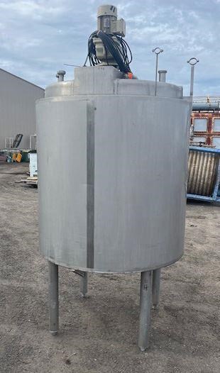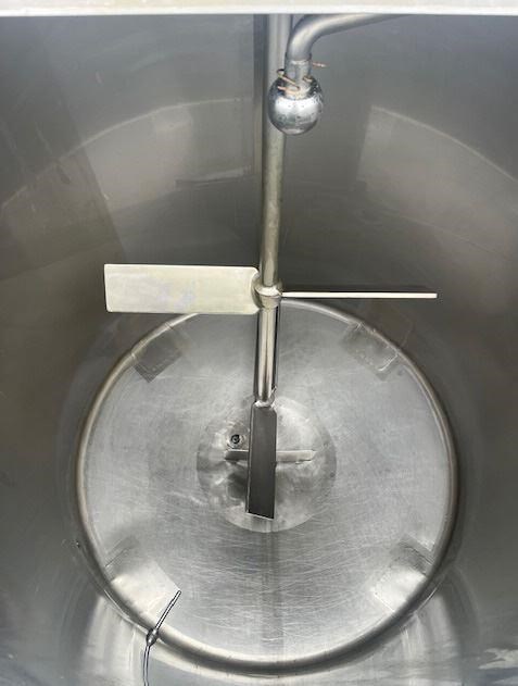 Stainless steel insulated mixing tank. 0.75kw 38 rpm mixer drive. Conical base to a 2 inch outlet. 1.2m dia x 2.9m overall height. Spray ball in top.