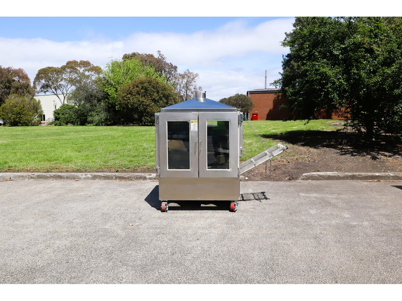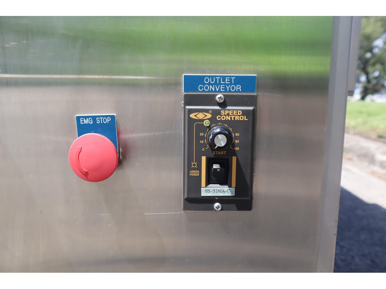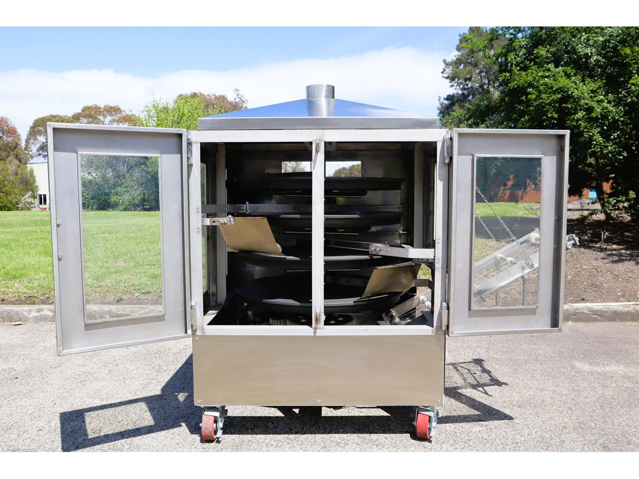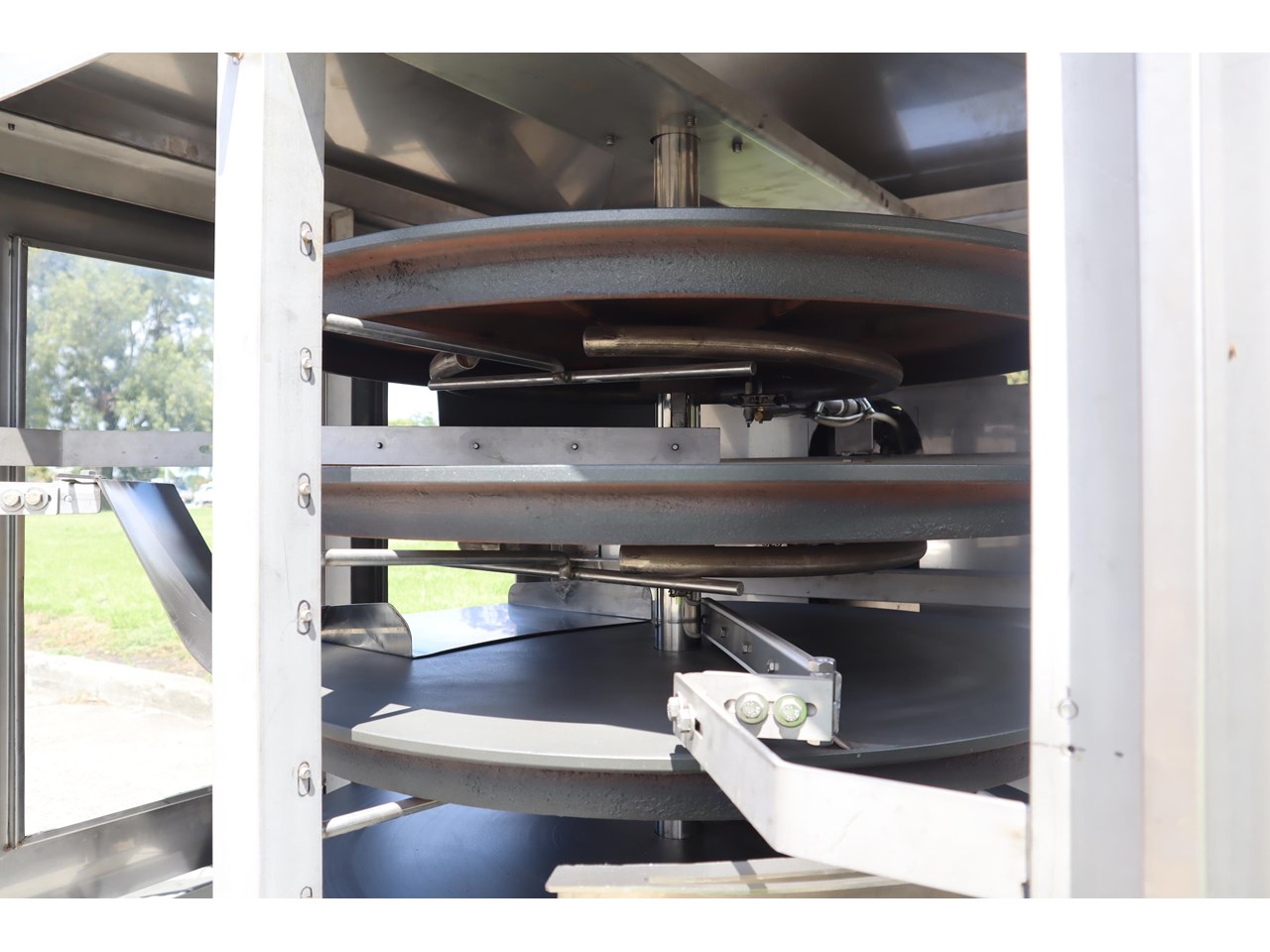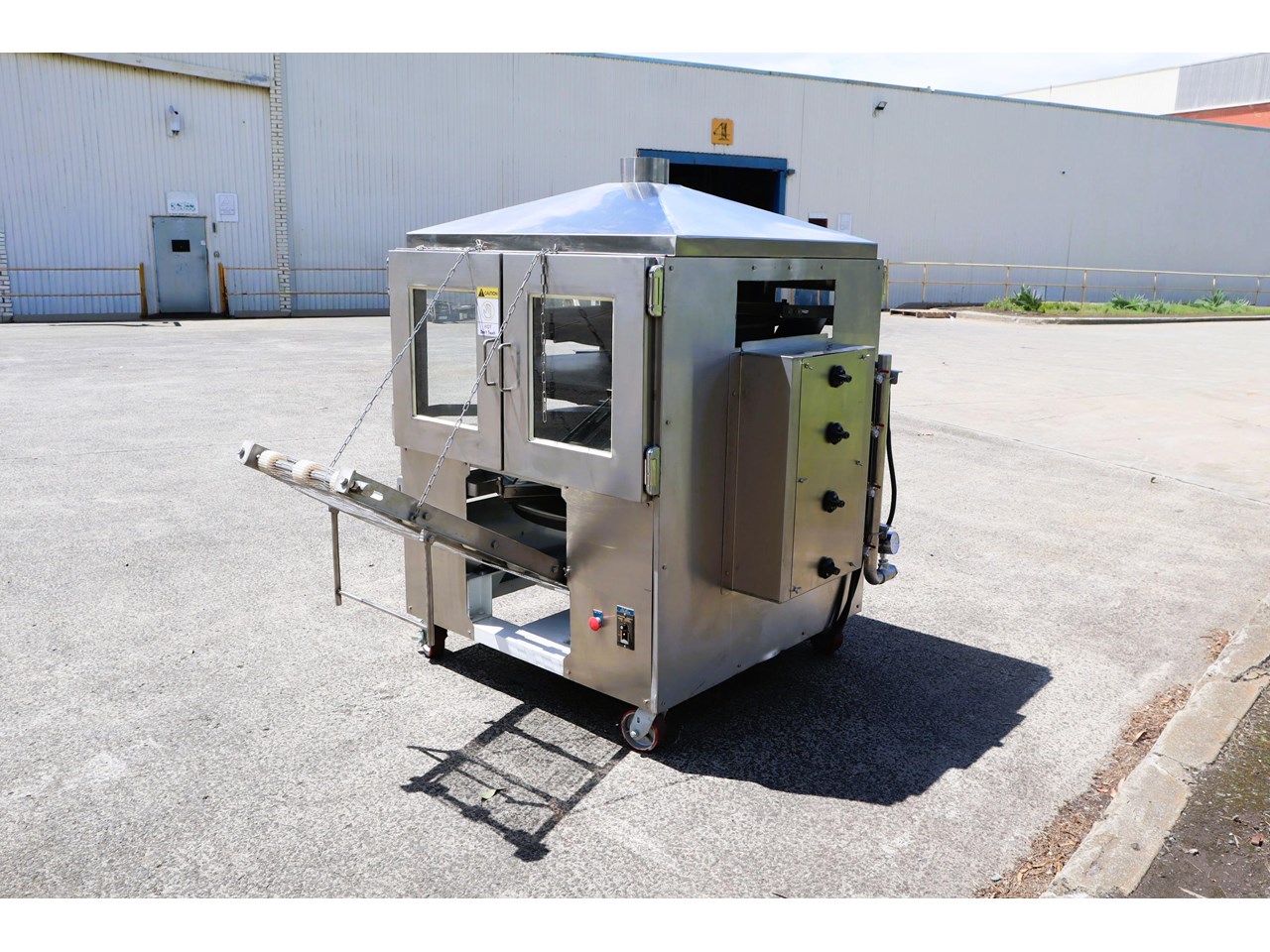 Industrial tortilla oven in excellent condition designed for continuous baking of tortillas as part of a commercial production line. Full stainless steel construction with viewing panels allows for consistent baking and monitoring during operation.