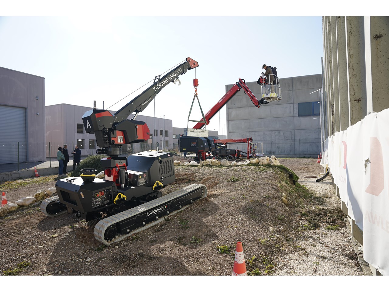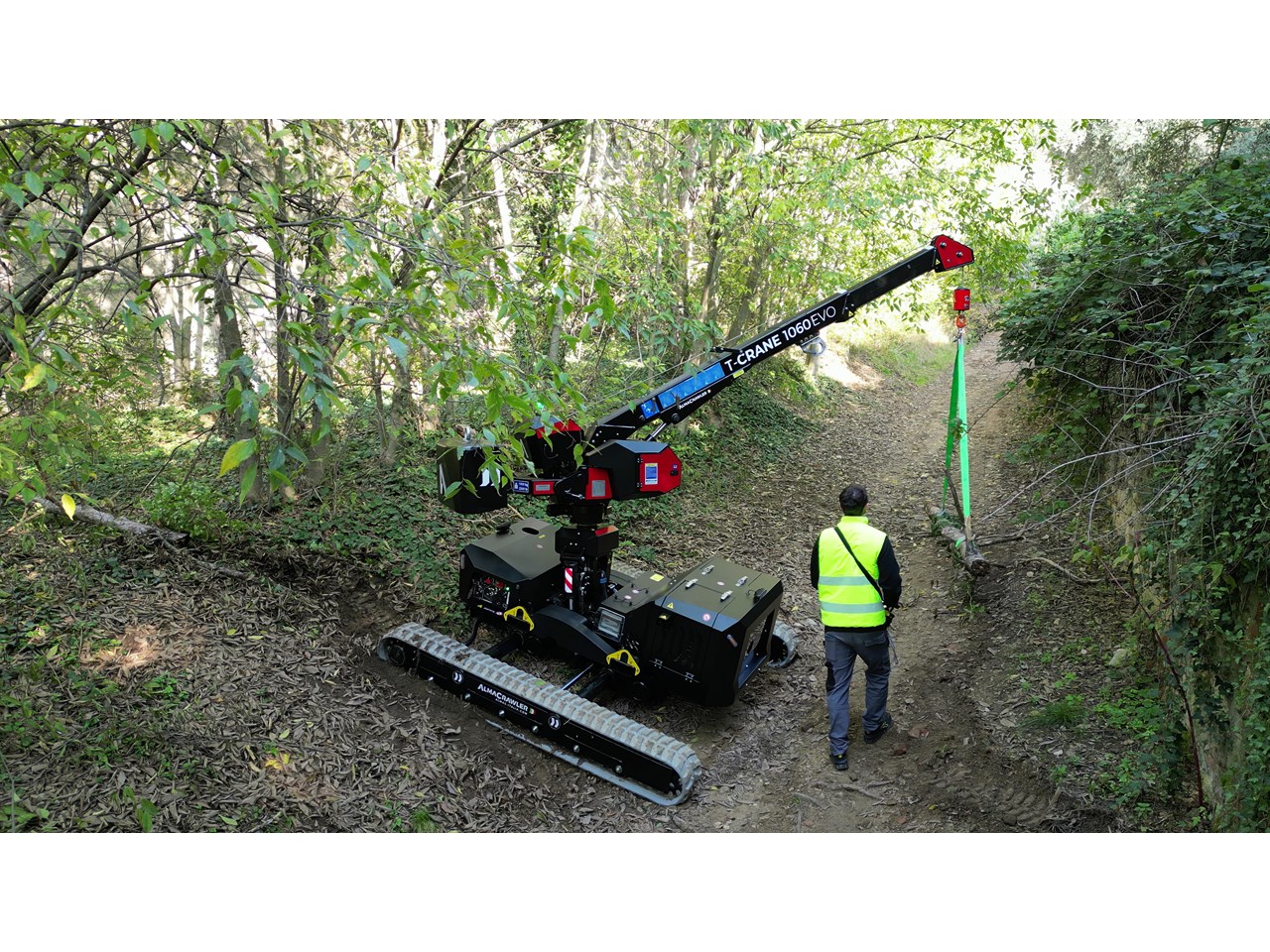 Equipped with a standard remote control, the T-Crane 1060 easily travels and carries loads up to 990kg, featuring a 7.7m lifting height with a 6.1m maximum working radius.