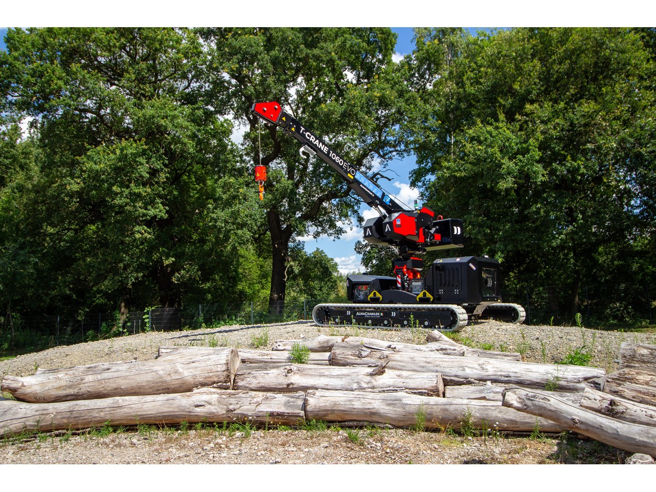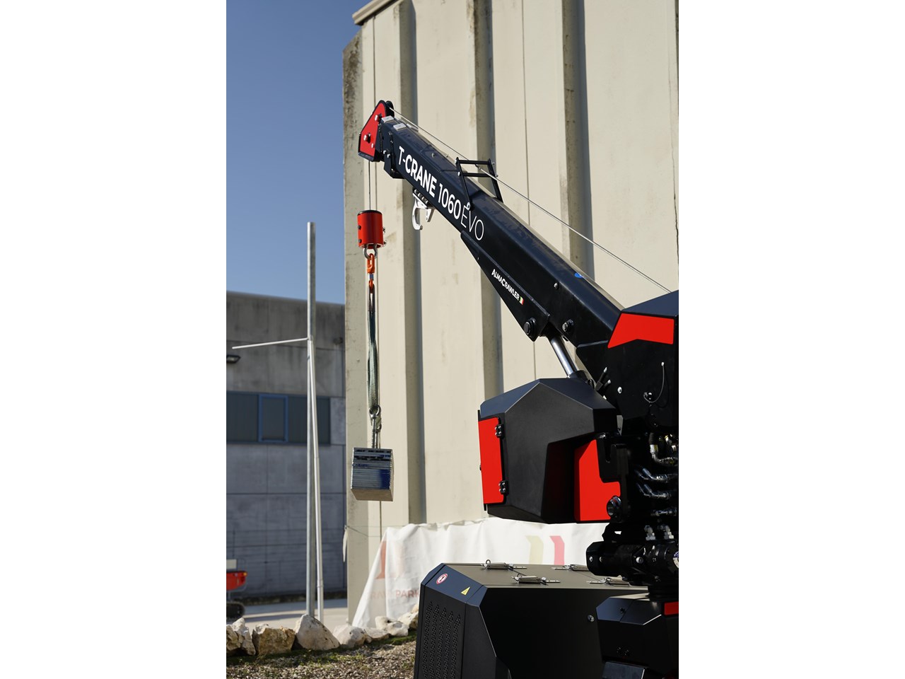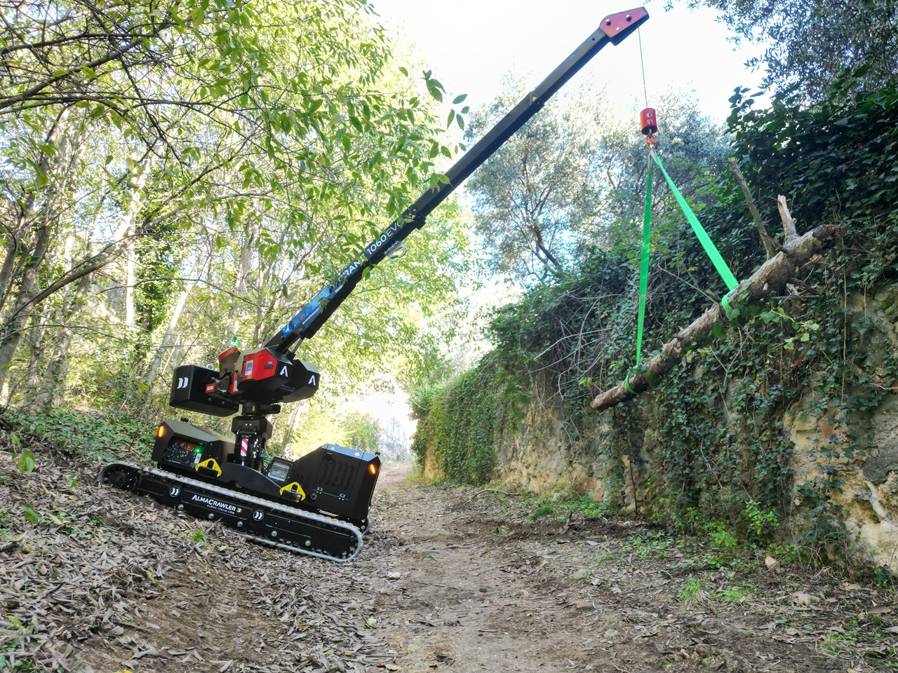 Pick & carry mini-crane with AlmaCrawler self-levelling technology, available either with a Yanmar engine or a full-electric 300Ah Lithium battery pack.