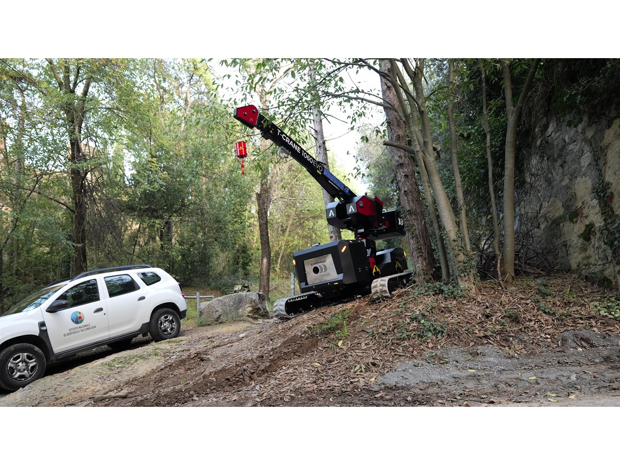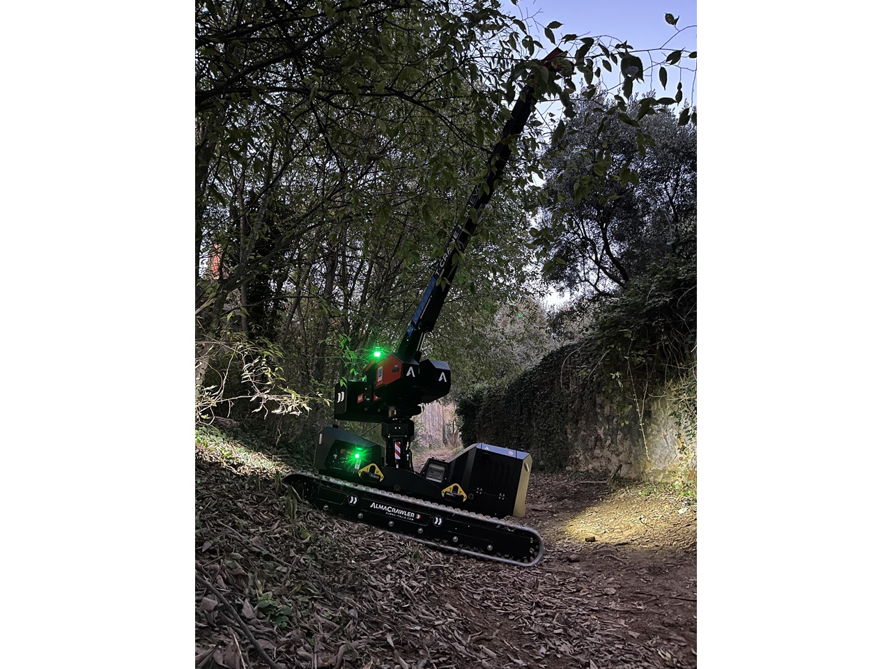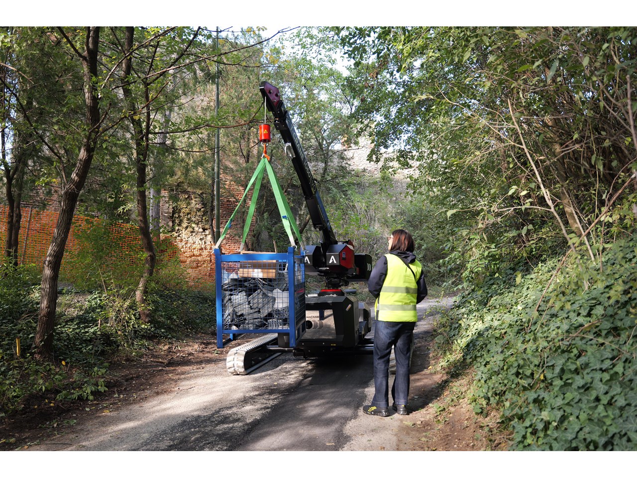 Pick & carry mini-crane with AlmaCrawler self-levelling technology, available either with a Yanmar engine or a full-electric 300Ah Lithium battery pack.
