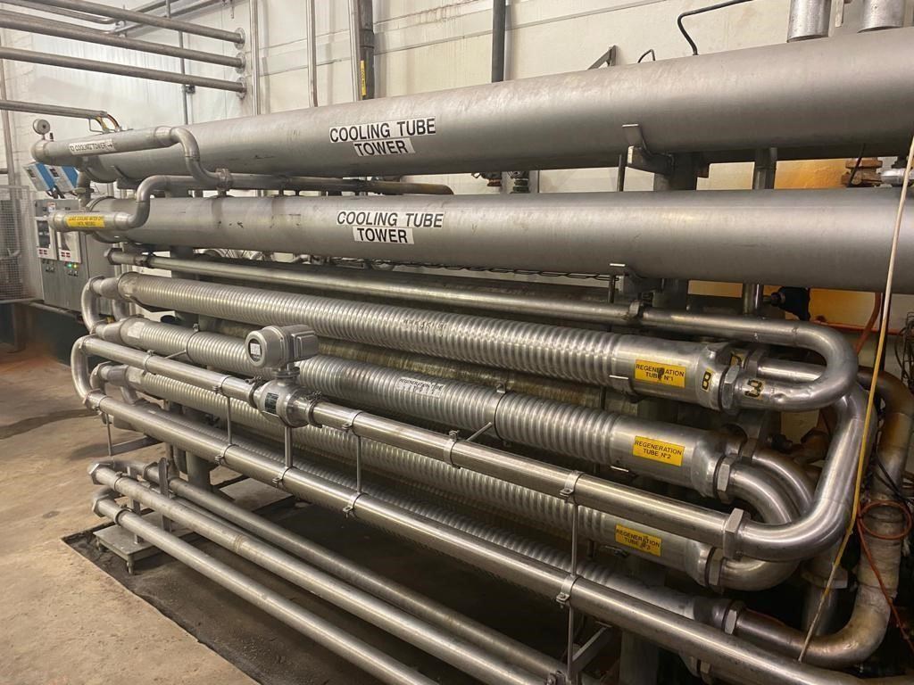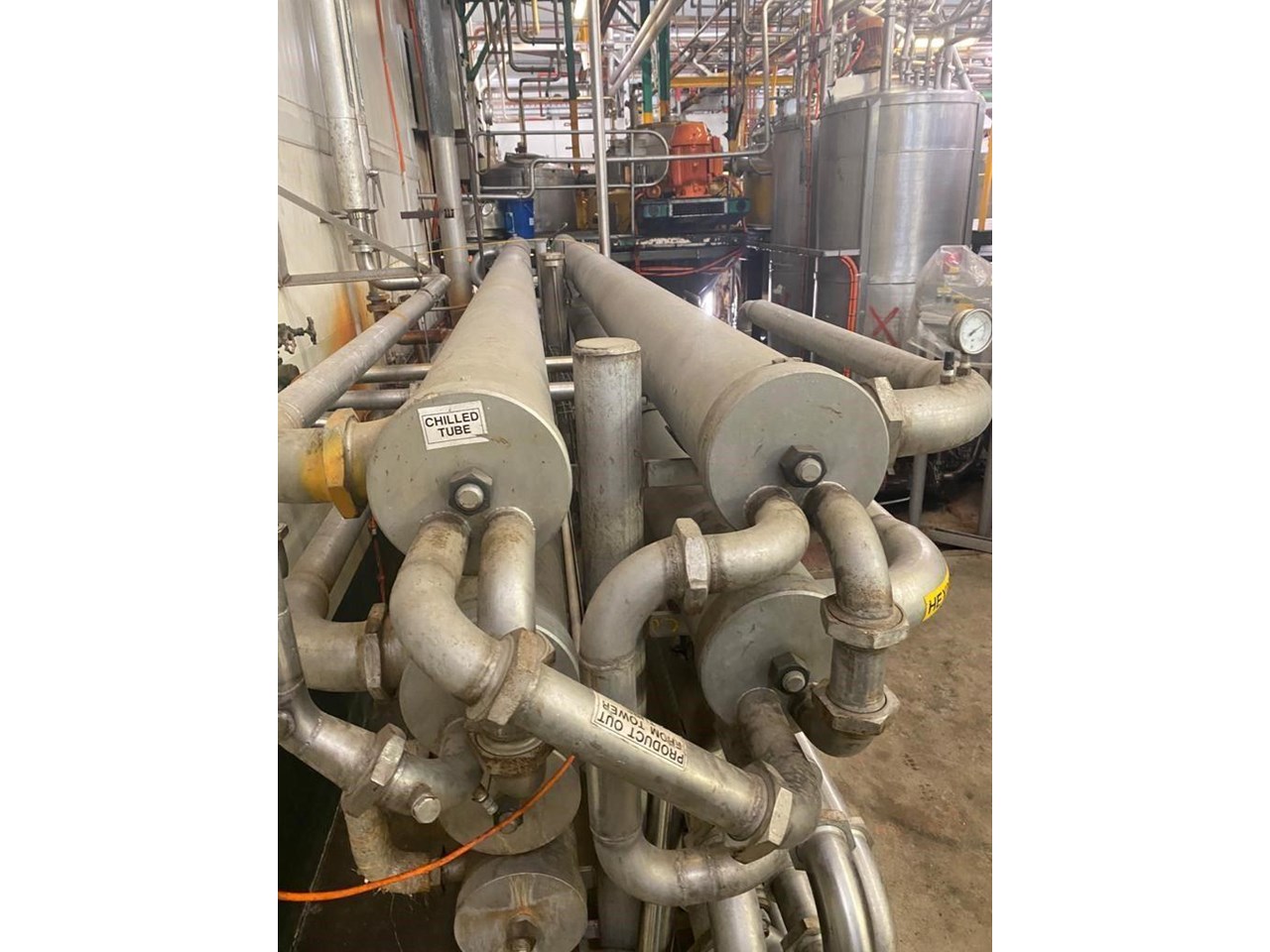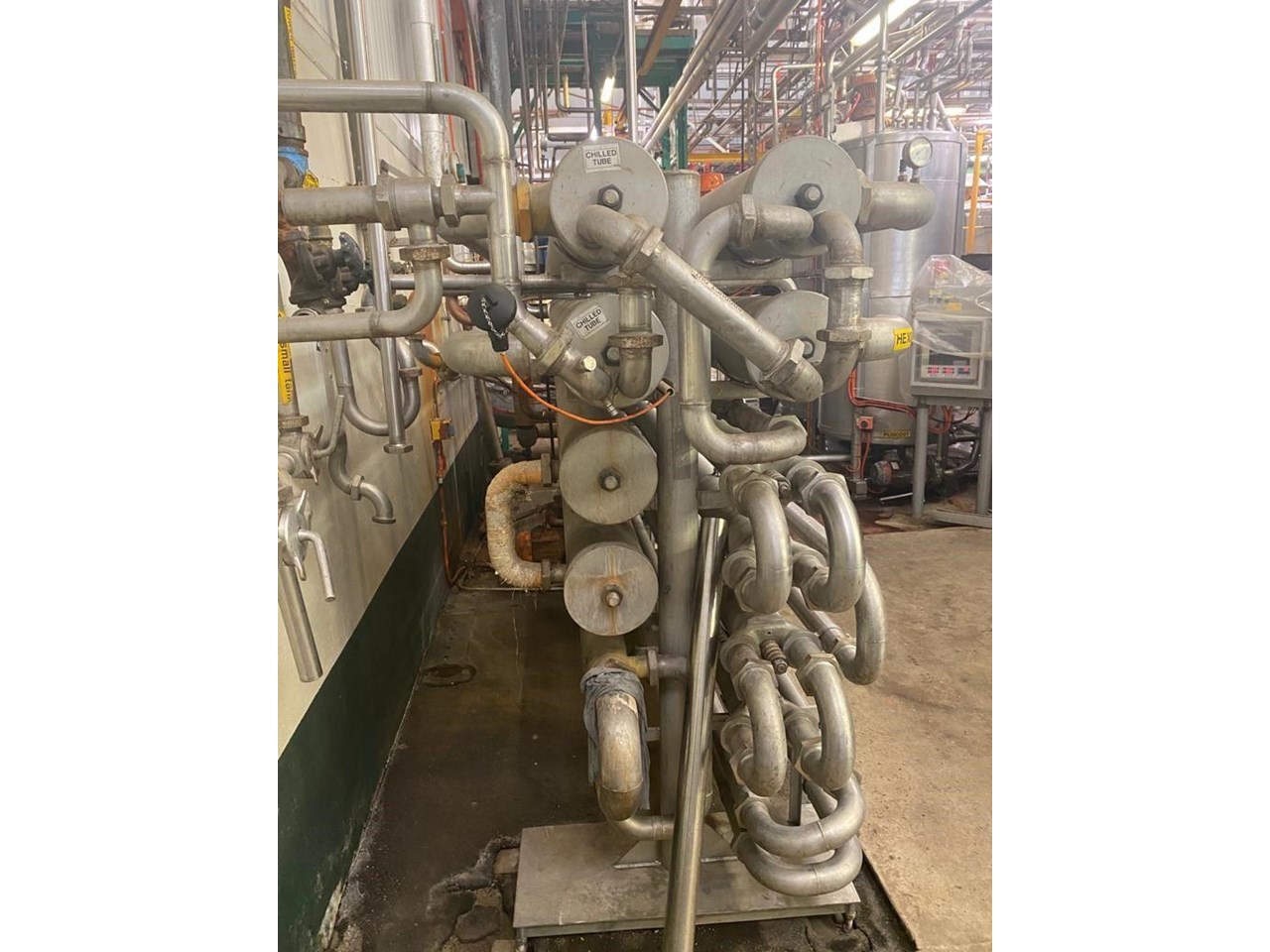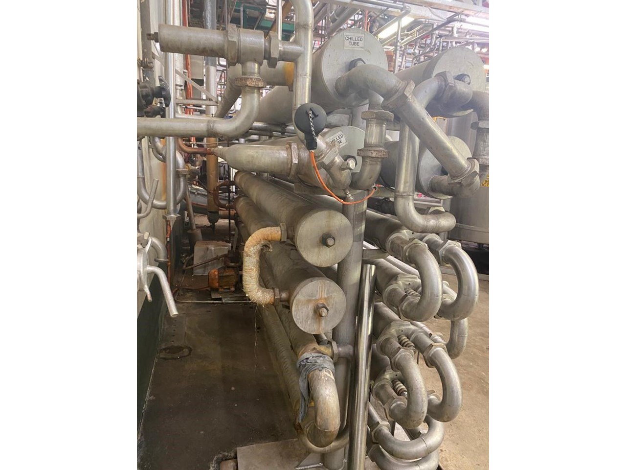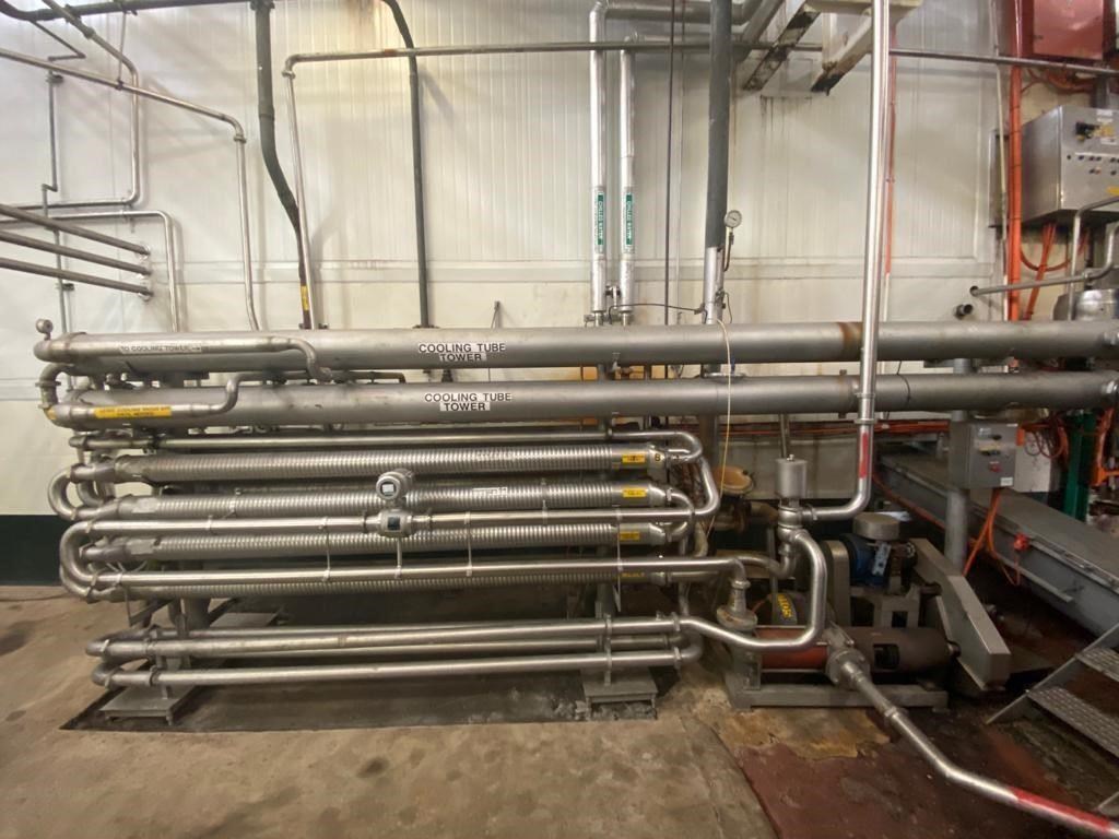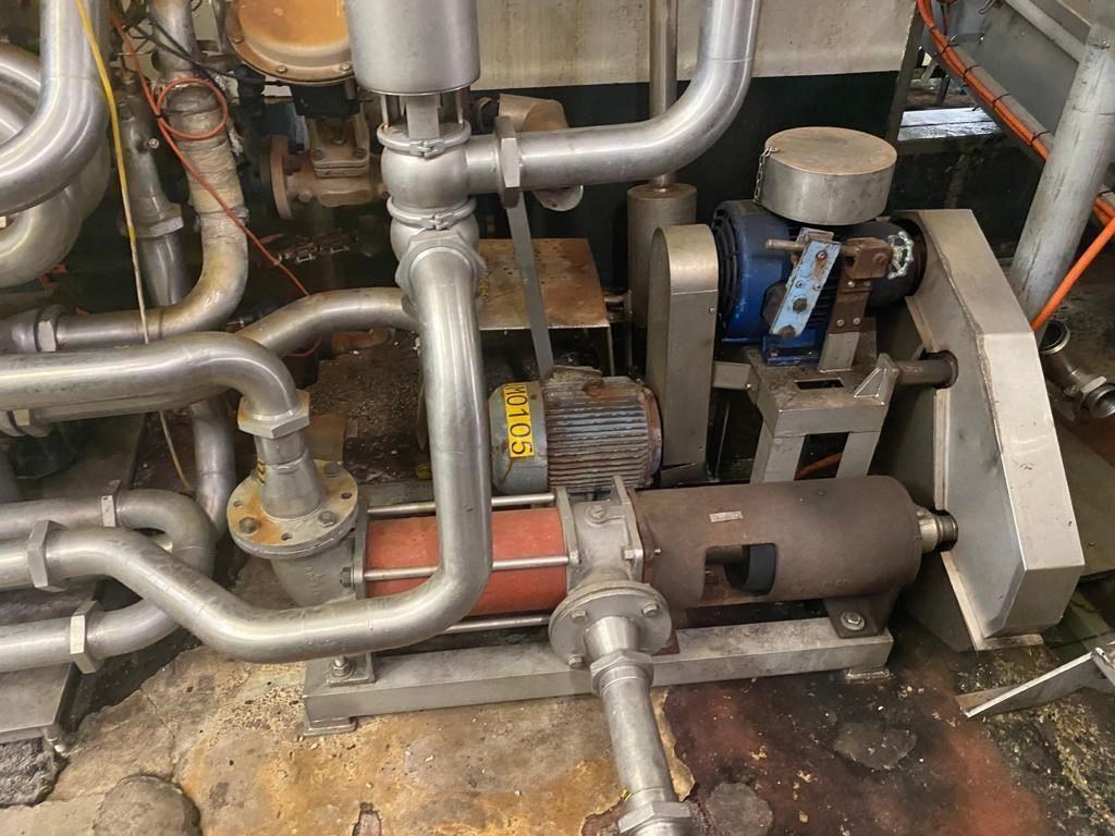 20,000lt per hour APV pastuerizer. Last processing pineapple and apple juice. complete with 4 inch mono pump and centrifugal pump. No controls. APV flash cooler mounted on top.