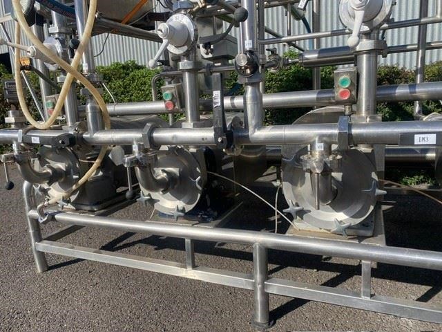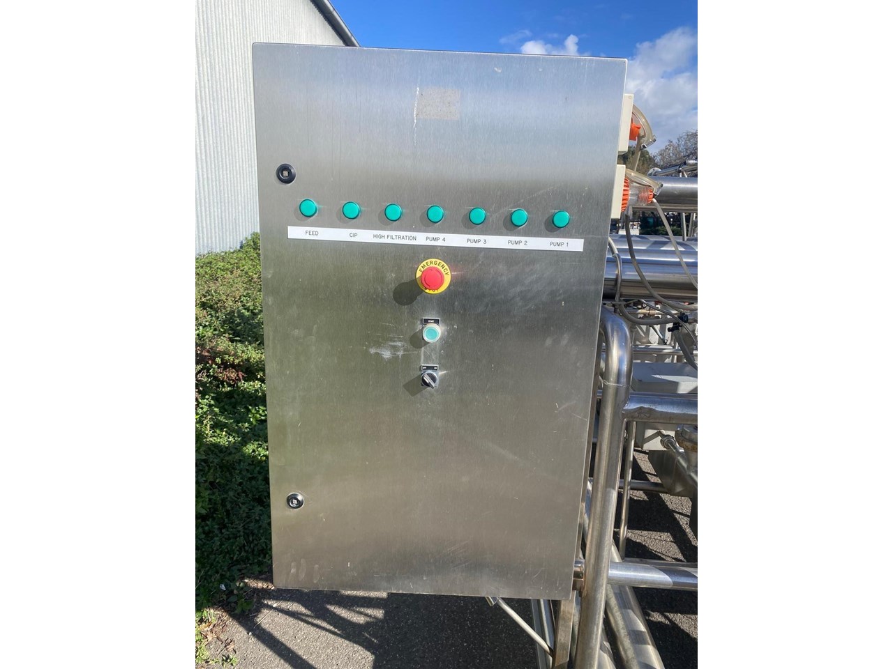 Skid mounted Ultra filtration plant, consists of 4 x Fristam Pumps, 1 x CIP pump,1 x mono solids pump, 4 x filter housing, interconnecting pipework and valves. Filter membrane 190cm x 110mm dia. Was doing approx 3000lt per hour on milk. Can be used for plant proteins. Capable of CIP. Ultrafiltration for concentration of milk, whey and plant-based protein is widely used in the dairy and plant-based industries as a concentration step in the process of making different whey, milk or plant-based powder products. Also different fresh cultured cheeses like cream cheese, feta and queso fresco can be produced by UF concentration with a substantially higher yield. It is a highly sustainable, versatile, and proven process designed to increase the production capacity and allows for higher yields and less waste by valorization of sub product and recovery of water. Advantages Proven components and system design Proven membranes for any dairy application High performance and long membrane lifetime High-quality engineering, standardized system Speed controllers on all motors Optimized utility consumption Pre-assembled in our manufacturing facilities Operator and maintenance friendly