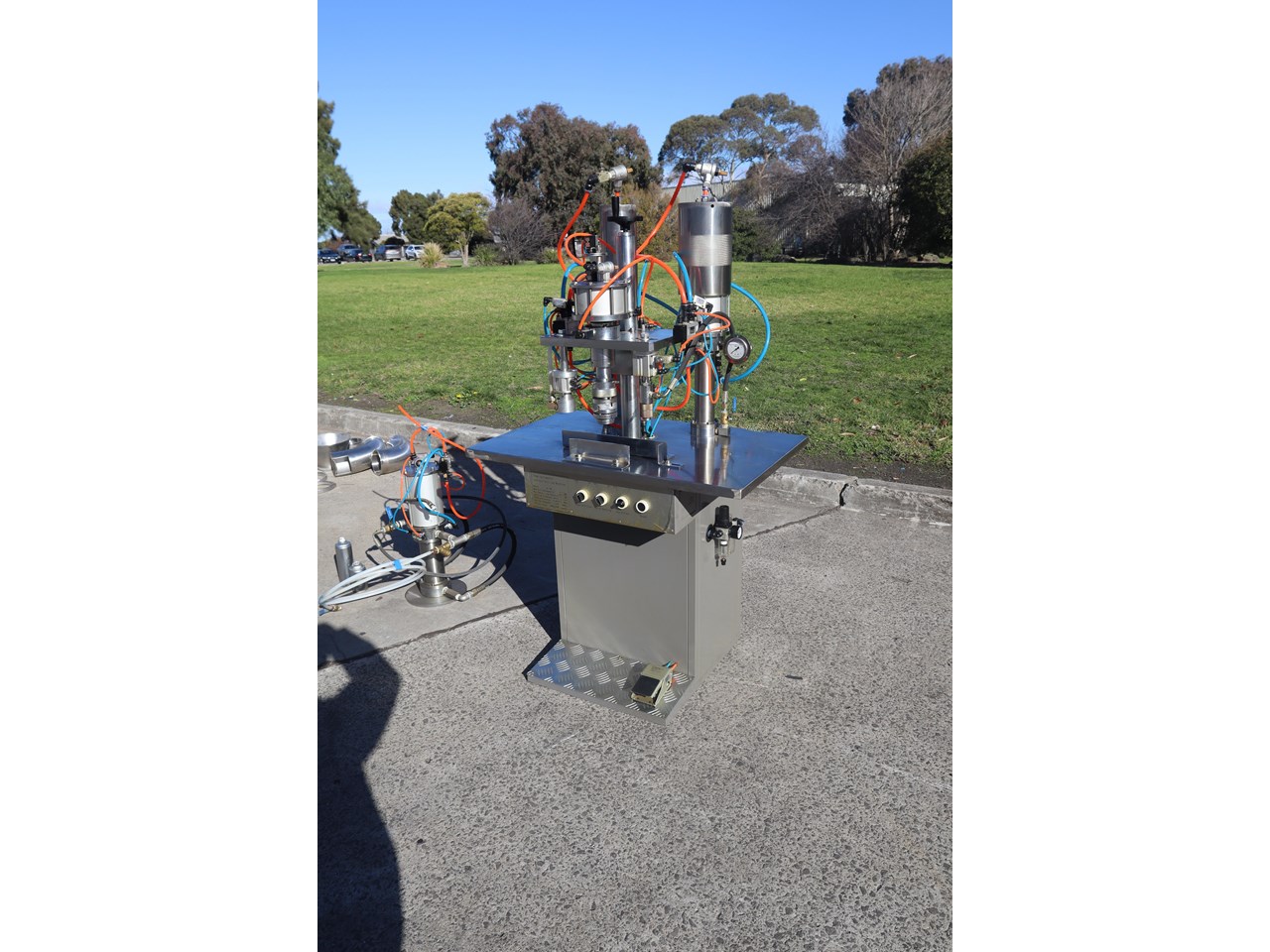 This semi-automatic bottle filling line is equipped to perform three tasks: liquid filler, crimper, and gas filler.