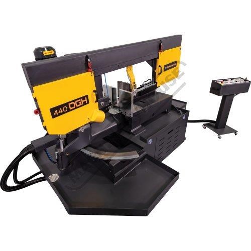The European made BMSY-440DGH dual mitre up to 60°, semi-automatic band saw can cut a large 600 x 440mm rectangle. This saw can also cut up to 440mm round material at 90° and with a hydraulic clamping mechanism that allows the operator to change the mitre angle in seconds. The inverter controlled infinitely variable speed is easily adjusted to suit desired blade speed via the control dial mounted conveniently on the control panel. The vice uses a full stroke hydraulic clamping system and after the cut is complete the blade stops and the head lifts to the start position ready for the next piece to be cut.