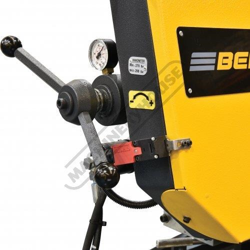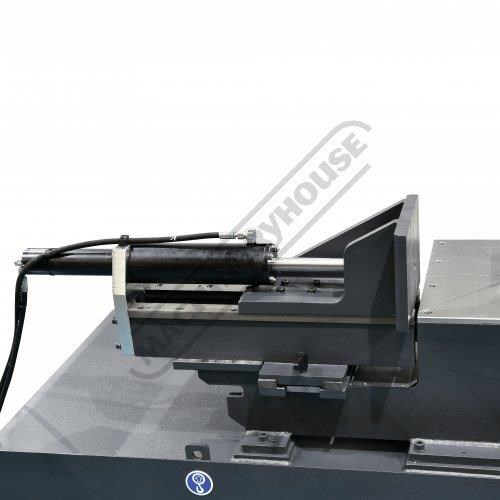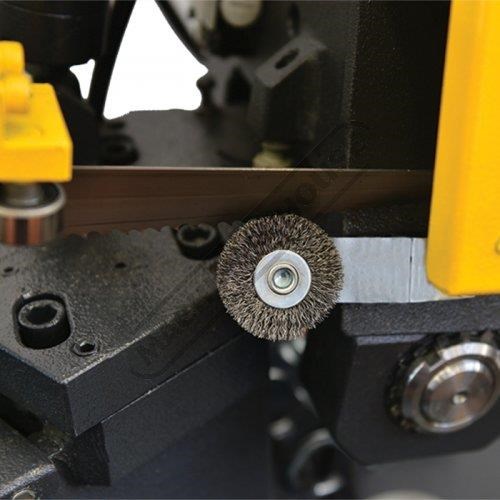 The blades are guided via roller bearings & tungsten carbide inserts offering superior rigidity, cutting accuracy and longer blade life. The feed is hydraulic controlled and fine-tuned from the control panel for the perfect feed rate required to suit your application. This band saw has a powerful coolant system and a blade tensioning device that shuts down the machine if the blade breaks.