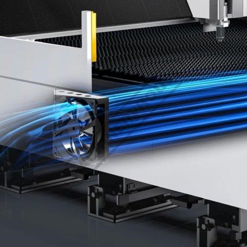 Follow-up dust removal-The function significantly improves the cleanliness of the cutting process. It works by dividing the cutting area into multiple partitions and using a combination of internal and external fans to create a powerful airflow that effectively removes fumes and dusts from the cutting zone in real time..