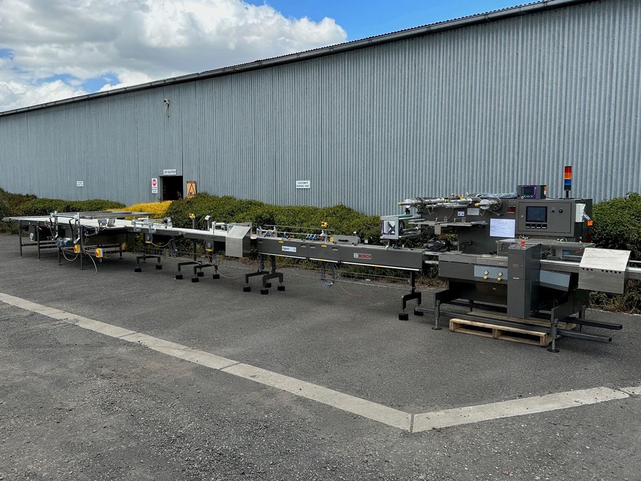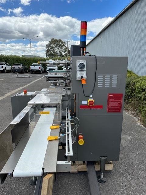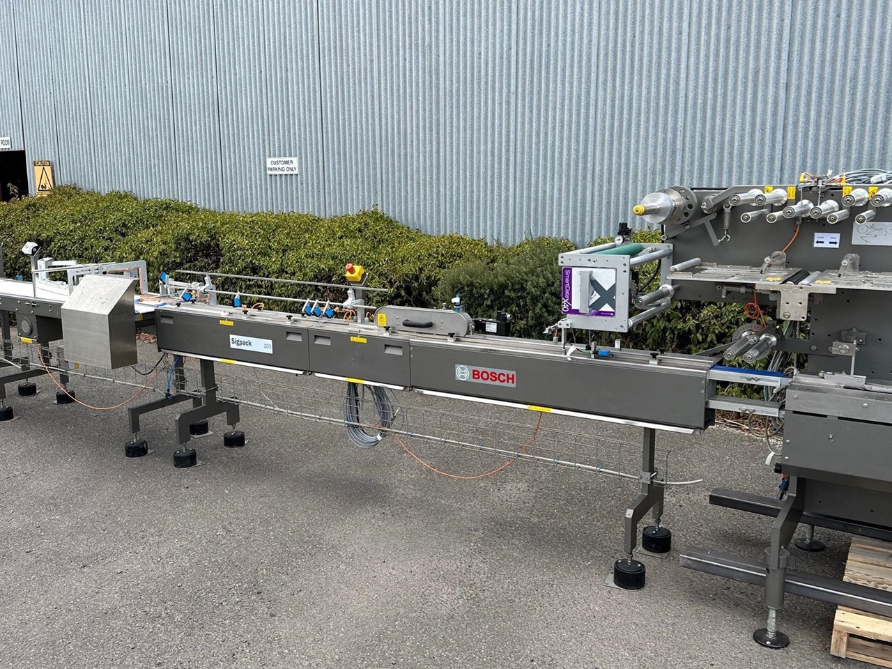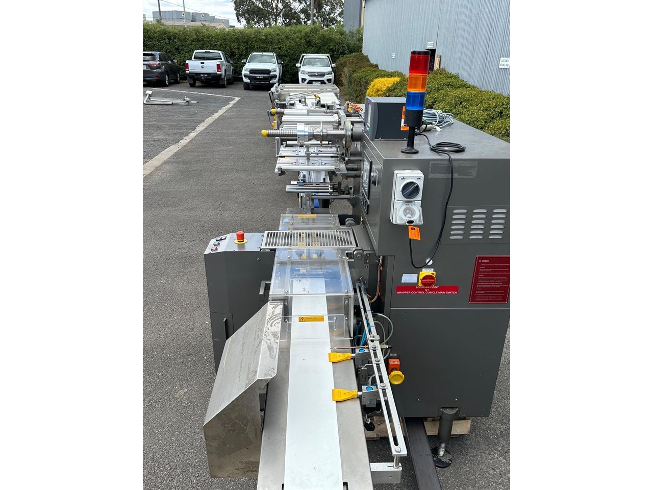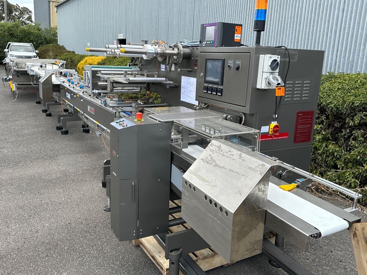 Bosch Horizontal Flow Wrapper confectionary line This Horizontal flow wrapper line has had very little use whilst in a large factory running trial products. The line was set up for small Chocolate bars but would suit protein bars, muesli bars and a range of other confectionary and health bar type products. The line consists of two large infeed conveyors where the product was dumped on to a sorting conveyor, which directed the chocolate bars from multiple rows into a single row. From there two chicaning conveyors correct the bars into a single lane and feed the bars into the timing conveyor. After this the bars are feed into the Flow wrapper and sealed and can move into a secondary packaging machine (this is not available.) Benefits Productivity: High performance, rugged design and reliability Easy: Operation, size change, cleaning, maintenance Flexibility: Diverse product distribution, feeding and stacking options Standard Features Manual feeding with bakelite, nylon or stainless steel pushers PLC and touch screen display operation Photoelectric film centering Controlled web material unwinding performed by a servomotor driven system Automatic splicer for reel change, with manual preparation with double-sided tape One set of single rotating sealing jaws Straight cutting knife One set of format parts including tests for one product dimension Allen Bradley servomotors Application Examples Biscuits packaged flat and on-edge Wafers Molded and coated chocolates Candy bars Cereals Muesli bars Protein bars Other food products Specifications Output - Up to 1000 bags/min Film speed - Up to 50m/min Packaging Material - ET, BOPP, Laminated and coextruded Current product descrIption Length - 51mm Width - 39mm Height - 24mm Total line dimensions - 13796m L x 1.5m W YOM - 2015 Electrical and Pneumatic Power supply: 380 - 460 VAC Frequency: 50/60 Hz Control circuit: 24 VDC Pneumatic: Min. 6 bar Compressed air consumption: 1 m³/h