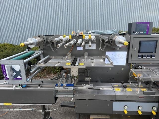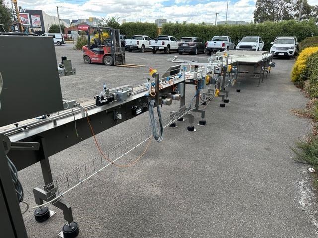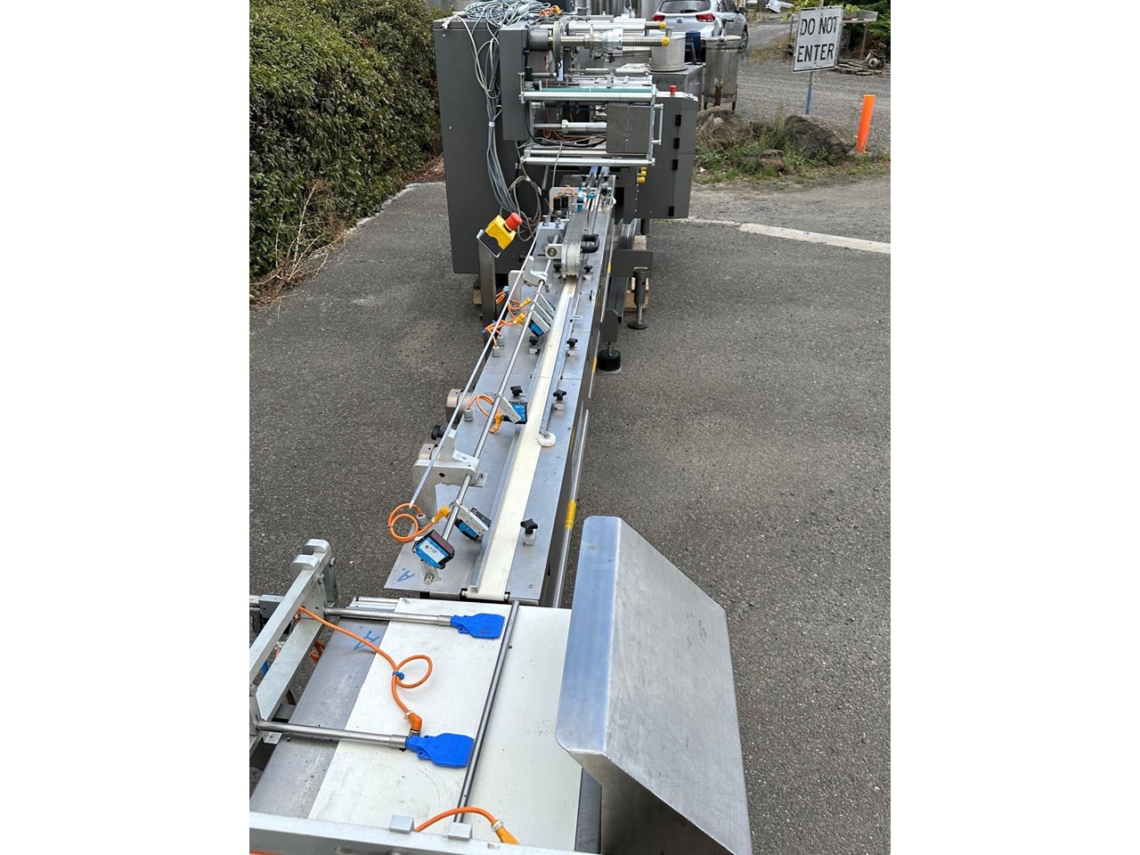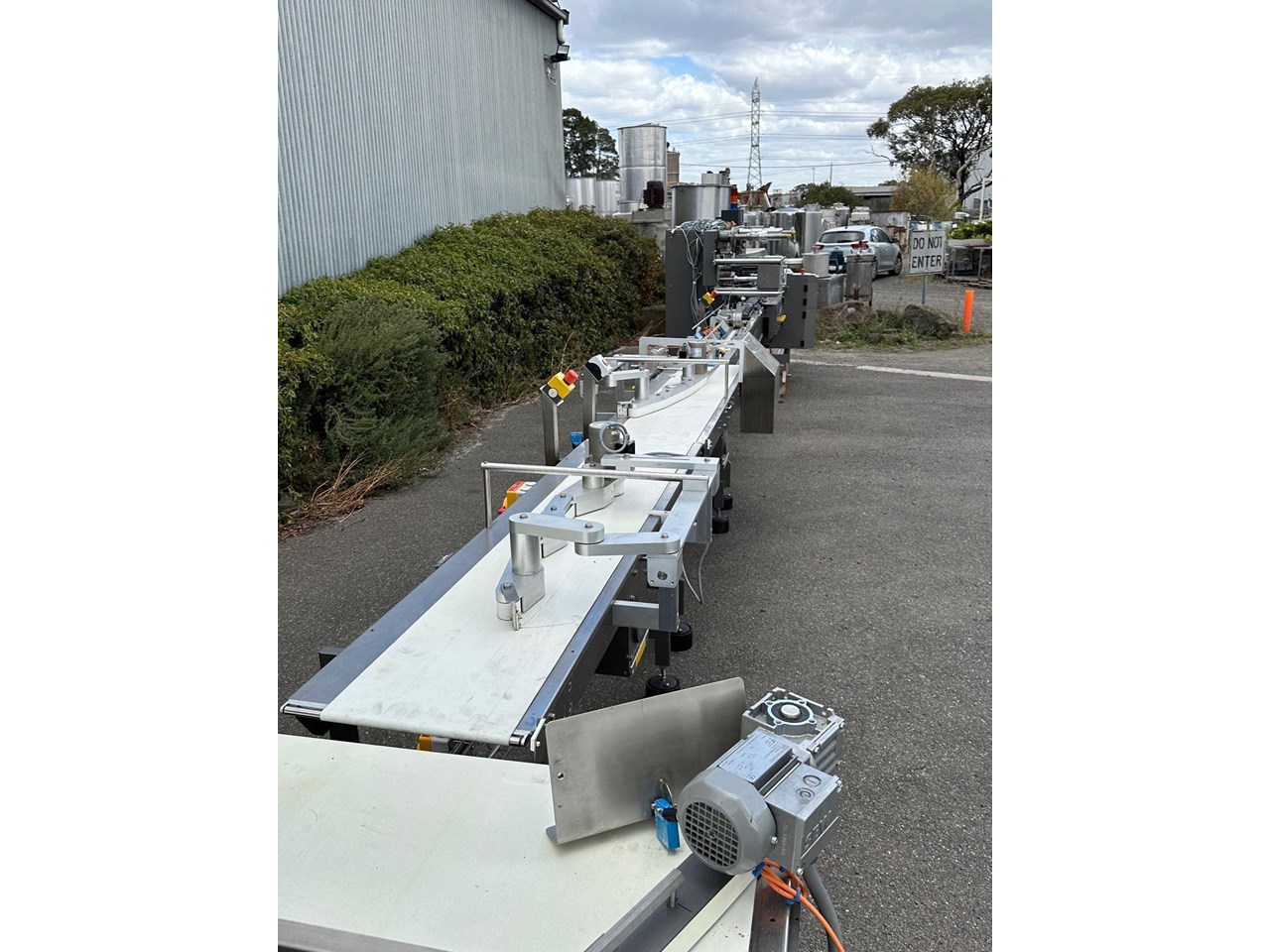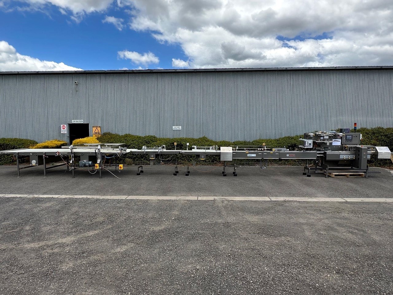 Bosch Horizontal Flow Wrapper confectionary line This Horizontal flow wrapper line has had very little use whilst in a large factory running trial products. The line was set up for small Chocolate bars but would suit protein bars, muesli bars and a range of other confectionary and health bar type products. The line consists of two large infeed conveyors where the product was dumped on to a sorting conveyor, which directed the chocolate bars from multiple rows into a single row. From there two chicaning conveyors correct the bars into a single lane and feed the bars into the timing conveyor. After this the bars are feed into the Flow wrapper and sealed and can move into a secondary packaging machine (this is not available.) Benefits Productivity: High performance, rugged design and reliability Easy: Operation, size change, cleaning, maintenance Flexibility: Diverse product distribution, feeding and stacking options Standard Features Manual feeding with bakelite, nylon or stainless steel pushers PLC and touch screen display operation Photoelectric film centering Controlled web material unwinding performed by a servomotor driven system Automatic splicer for reel change, with manual preparation with double-sided tape One set of single rotating sealing jaws Straight cutting knife One set of format parts including tests for one product dimension Allen Bradley servomotors Application Examples Biscuits packaged flat and on-edge Wafers Molded and coated chocolates Candy bars Cereals Muesli bars Protein bars Other food products Specifications Output - Up to 1000 bags/min Film speed - Up to 50m/min Packaging Material - ET, BOPP, Laminated and coextruded Current product descrIption Length - 51mm Width - 39mm Height - 24mm Total line dimensions - 13796m L x 1.5m W YOM - 2015 Electrical and Pneumatic Power supply: 380 - 460 VAC Frequency: 50/60 Hz Control circuit: 24 VDC Pneumatic: Min. 6 bar Compressed air consumption: 1 m³/h