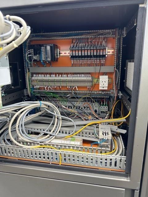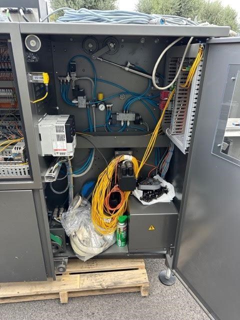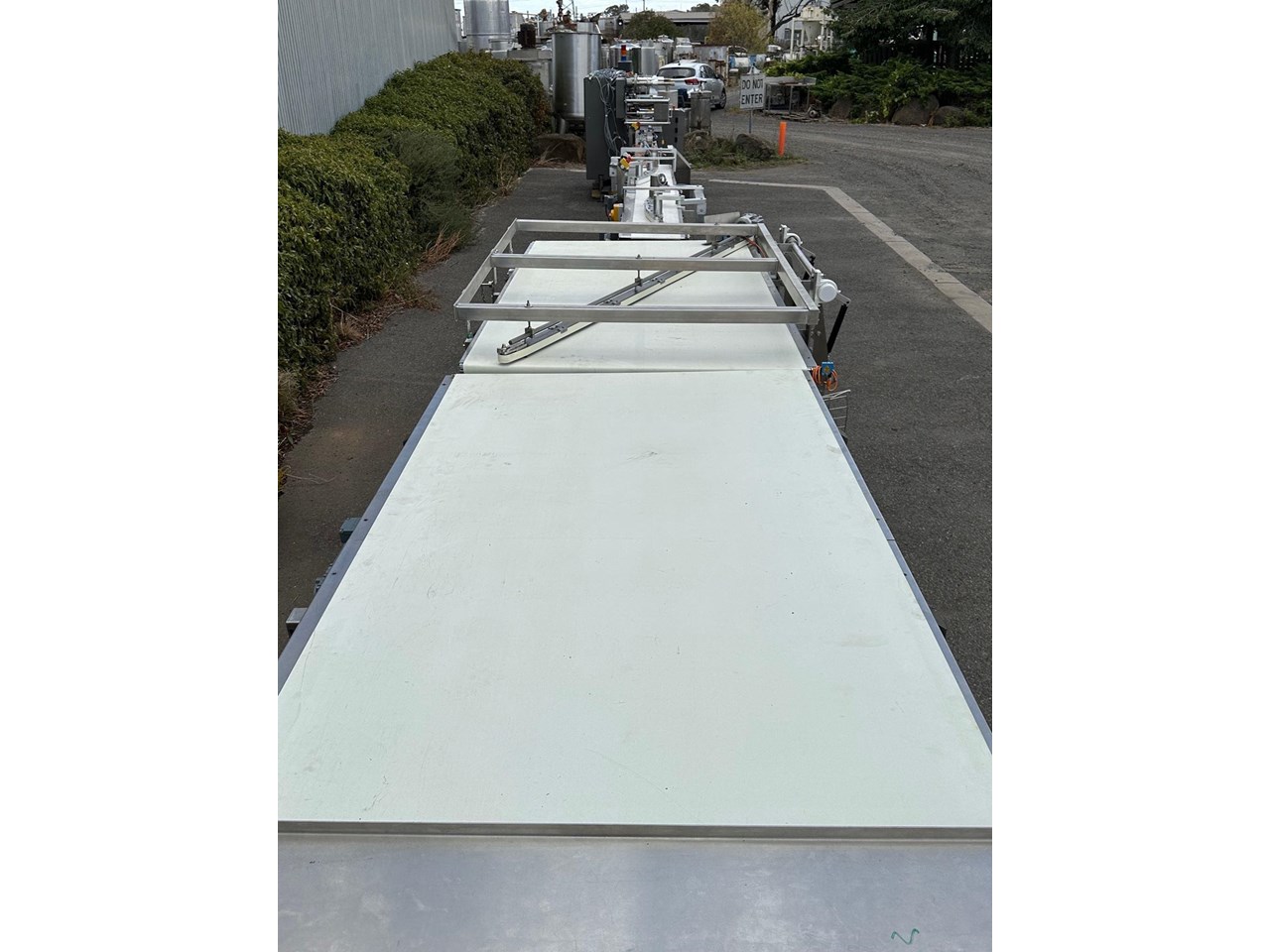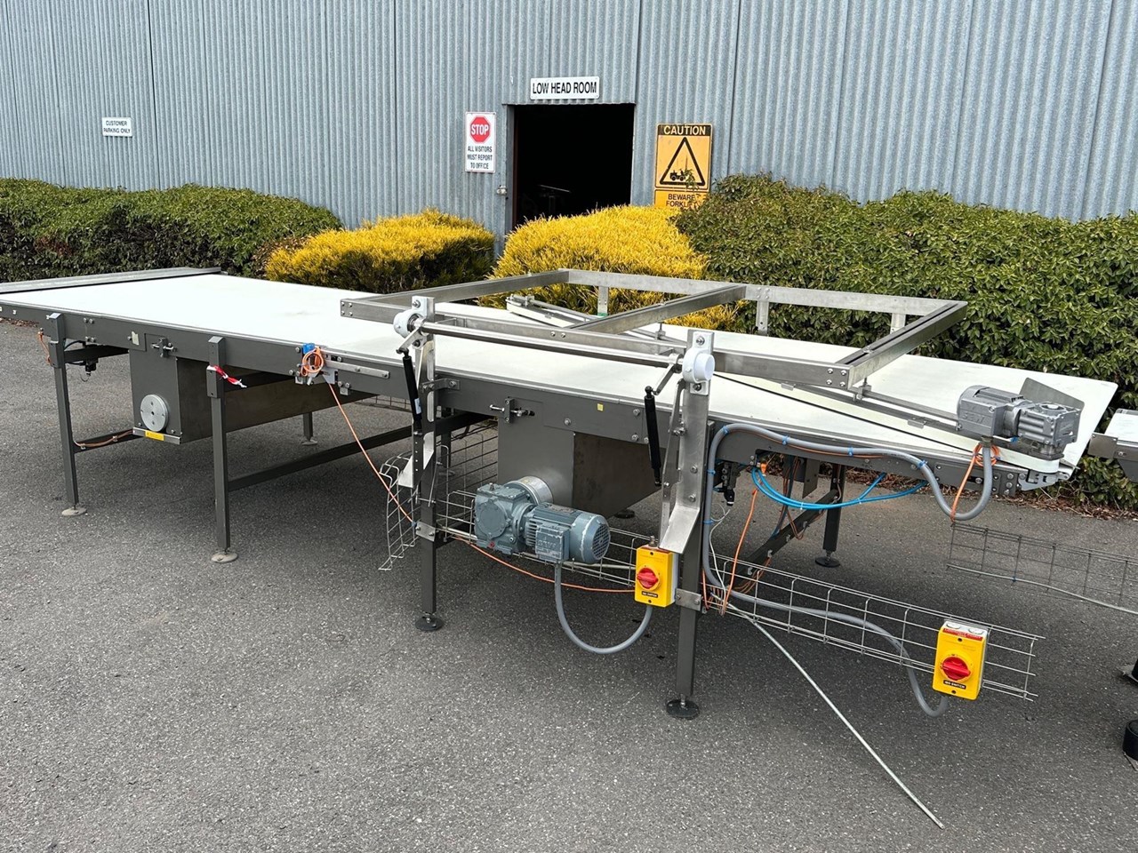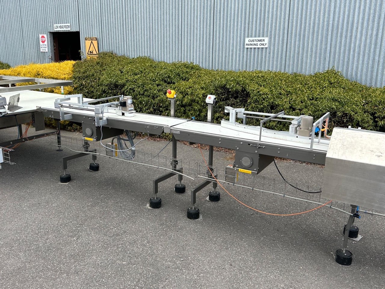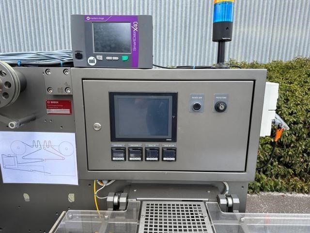 Bosch Horizontal Flow Wrapper confectionary line This Horizontal flow wrapper line has had very little use whilst in a large factory running trial products. The line was set up for small Chocolate bars but would suit protein bars, muesli bars and a range of other confectionary and health bar type products. The line consists of two large infeed conveyors where the product was dumped on to a sorting conveyor, which directed the chocolate bars from multiple rows into a single row. From there two chicaning conveyors correct the bars into a single lane and feed the bars into the timing conveyor. After this the bars are feed into the Flow wrapper and sealed and can move into a secondary packaging machine (this is not available.) Benefits Productivity: High performance, rugged design and reliability Easy: Operation, size change, cleaning, maintenance Flexibility: Diverse product distribution, feeding and stacking options Standard Features Manual feeding with bakelite, nylon or stainless steel pushers PLC and touch screen display operation Photoelectric film centering Controlled web material unwinding performed by a servomotor driven system Automatic splicer for reel change, with manual preparation with double-sided tape One set of single rotating sealing jaws Straight cutting knife One set of format parts including tests for one product dimension Allen Bradley servomotors Application Examples Biscuits packaged flat and on-edge Wafers Molded and coated chocolates Candy bars Cereals Muesli bars Protein bars Other food products Specifications Output - Up to 1000 bags/min Film speed - Up to 50m/min Packaging Material - ET, BOPP, Laminated and coextruded Current product descrIption Length - 51mm Width - 39mm Height - 24mm Total line dimensions - 13796m L x 1.5m W YOM - 2015 Electrical and Pneumatic Power supply: 380 - 460 VAC Frequency: 50/60 Hz Control circuit: 24 VDC Pneumatic: Min. 6 bar Compressed air consumption: 1 m³/h