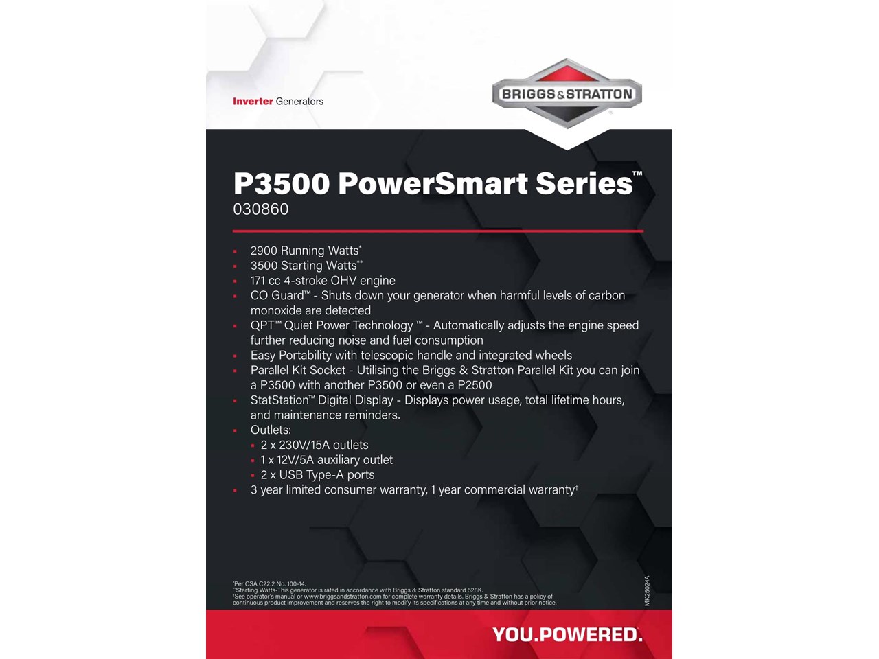 Looking for a quiet, reliable, and efficient portable generator? The Briggs & Stratton P3500 PowerSmart Series Inverter Generator with CO Guard delivers safe and dependable power for your next outdoor adventure or backup needs. Whether youre camping, caravanning, or need emergency power for light trade applications, this compact inverter generator is built to perform. Equipped with both a H shaped carry handle and a telescoping handle and wheels make the P3500 easy to move. In addition, the on-board LCD StatStation® display keeps you informed about power use, run time and maintenance reminders.