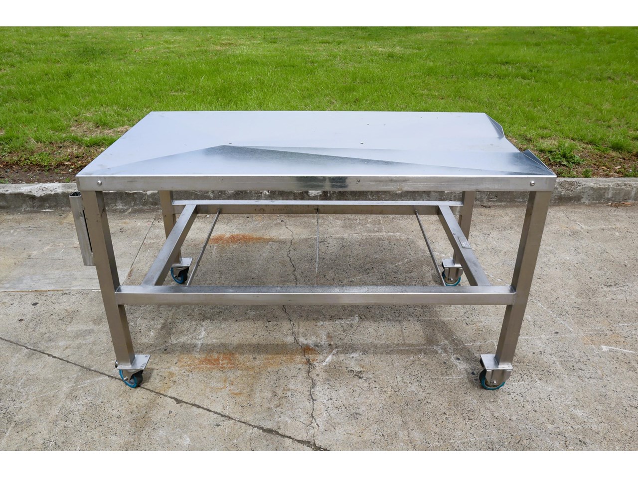 Stainless steel work table/trolley in great condition designed for hygienic production areas. Provides a solid, flat working surface with integrated mobility, allowing easy handling and movement of tools, product, or equipment.