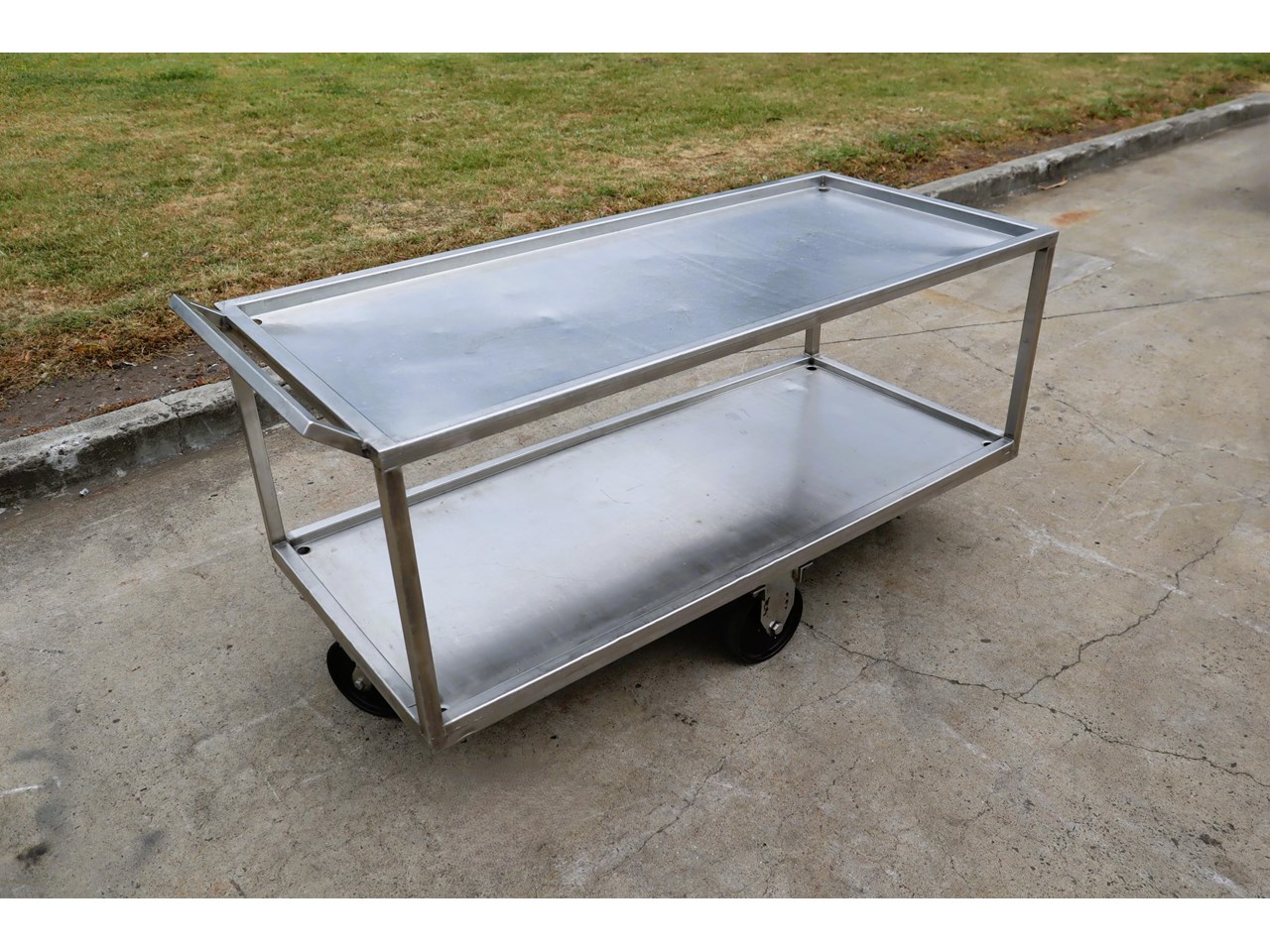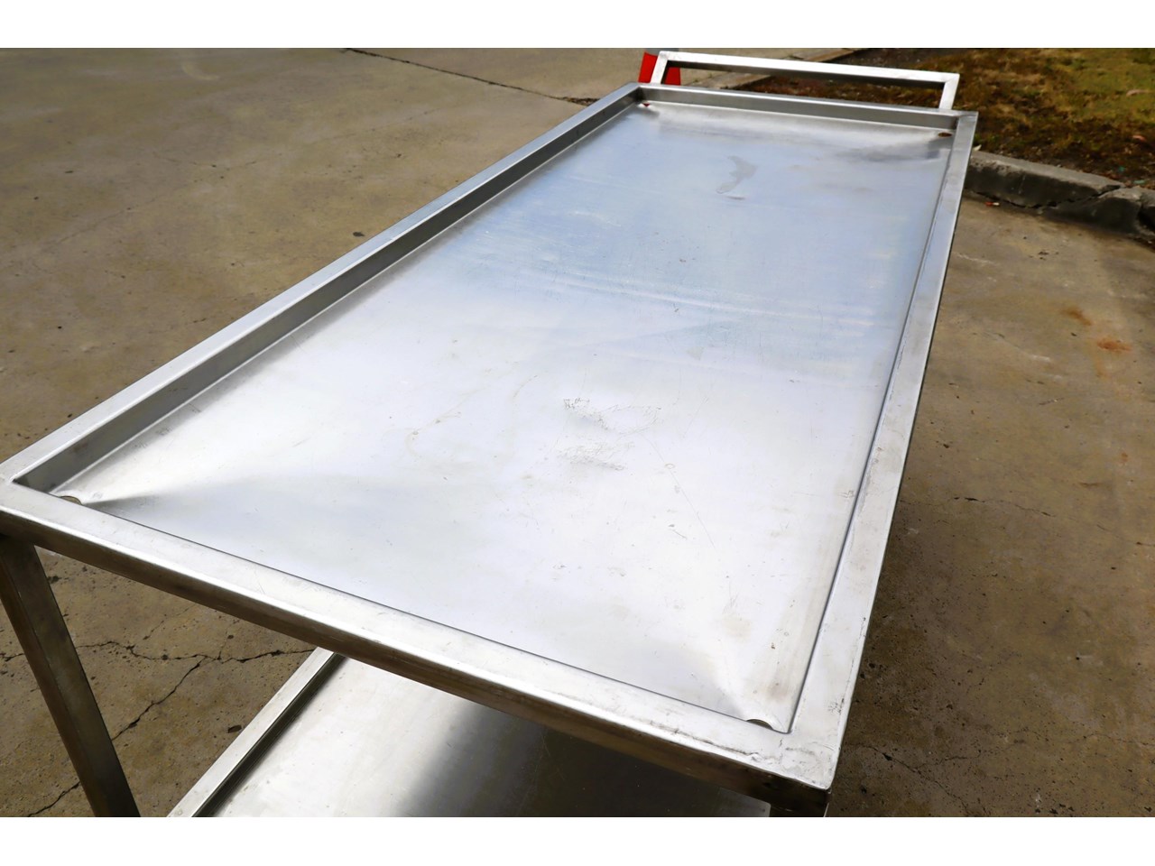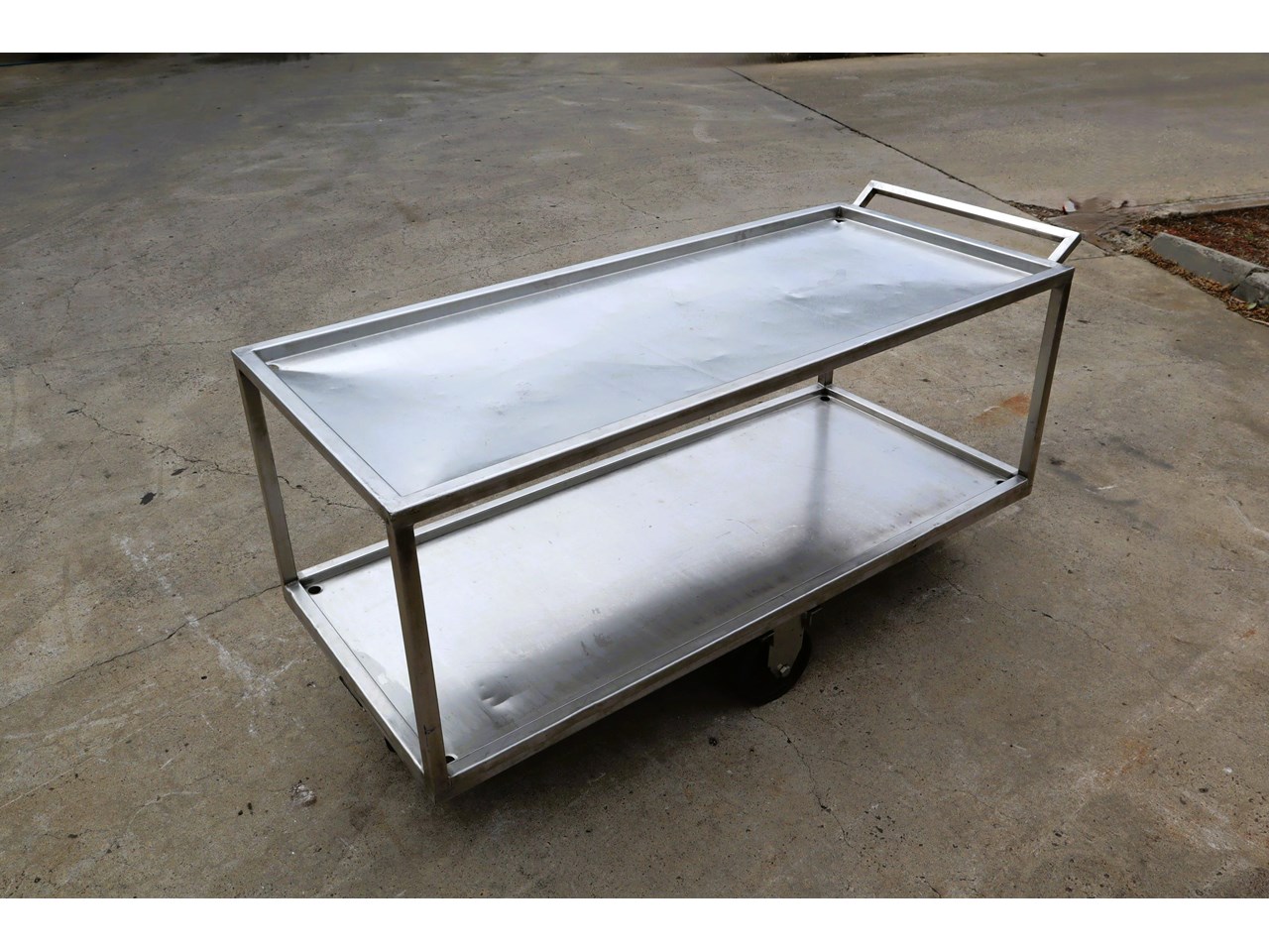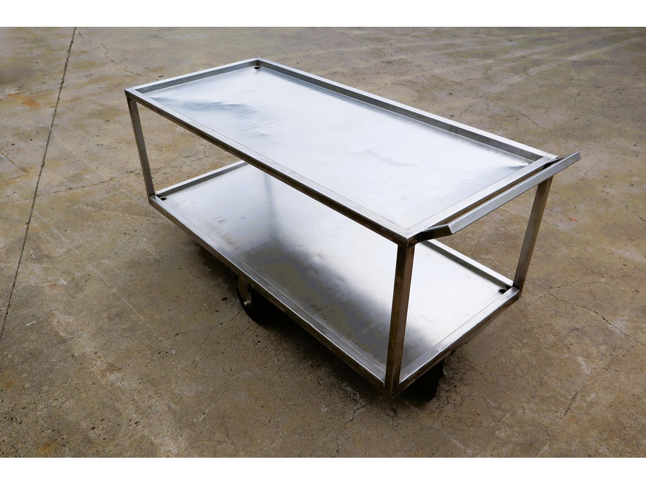 Stainless steel work table/trolley in great condition designed for hygienic production areas. Provides a solid, flat working surface with integrated mobility, allowing easy handling and movement of tools, product, or equipment. Fitted with a lower storage shelf near the base for convenient access to items while maintaining a clear workstation. Built for durability, stability, and ease of cleaning in food-grade and clean room environments.