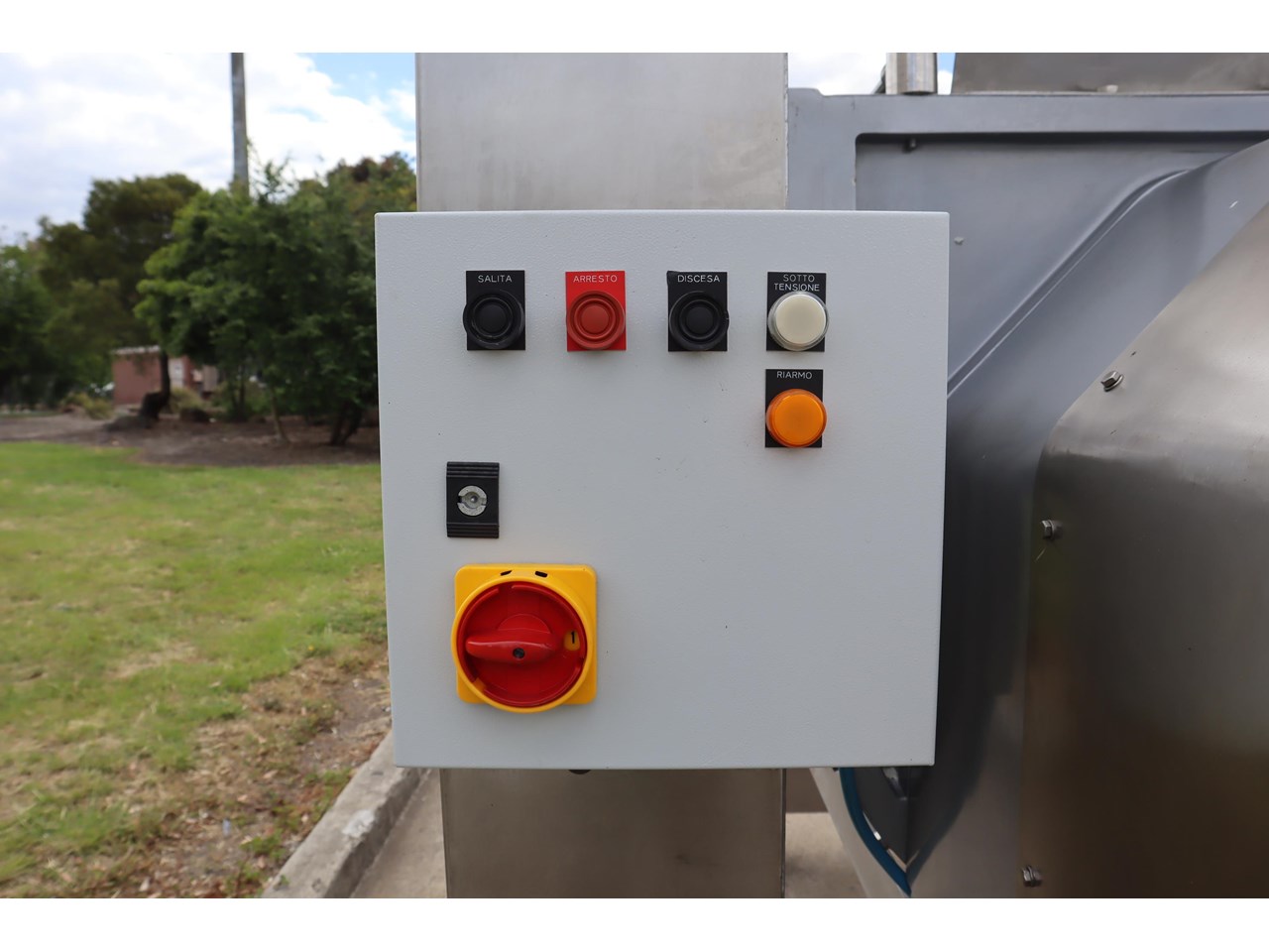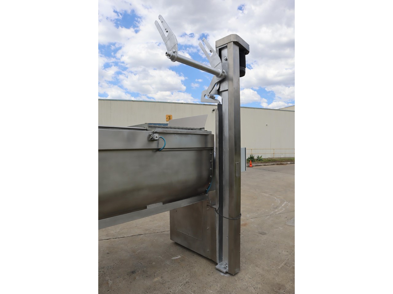 It is a twin shaft paddle mixer with a built on tub lifter.