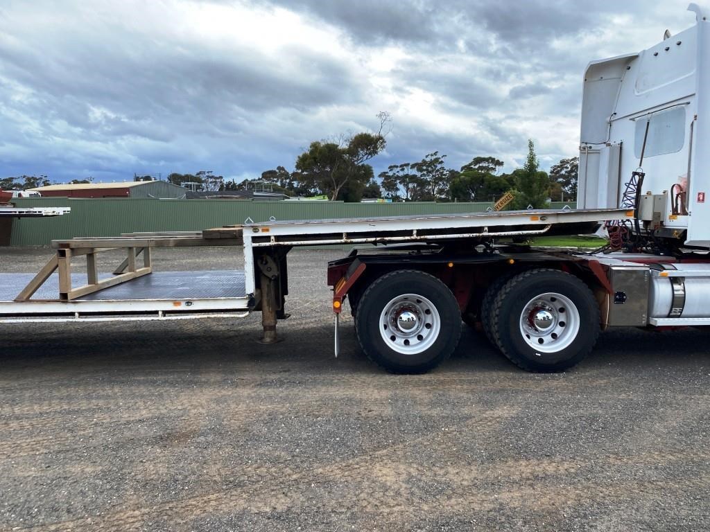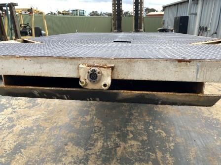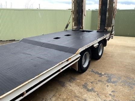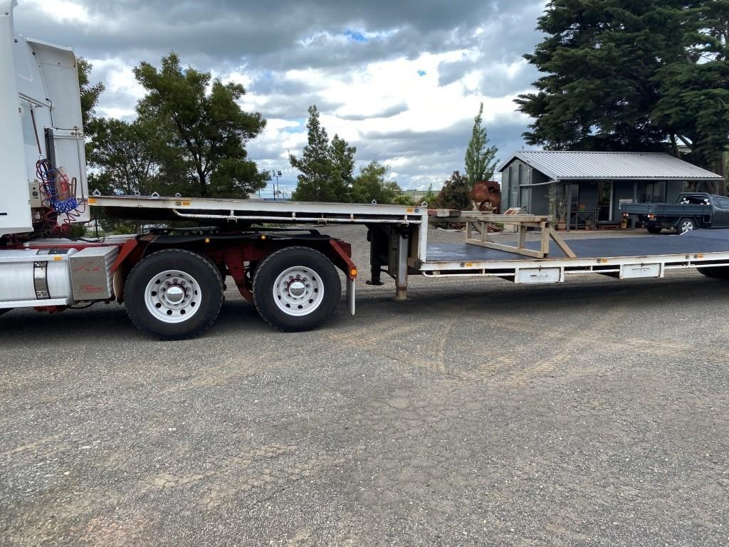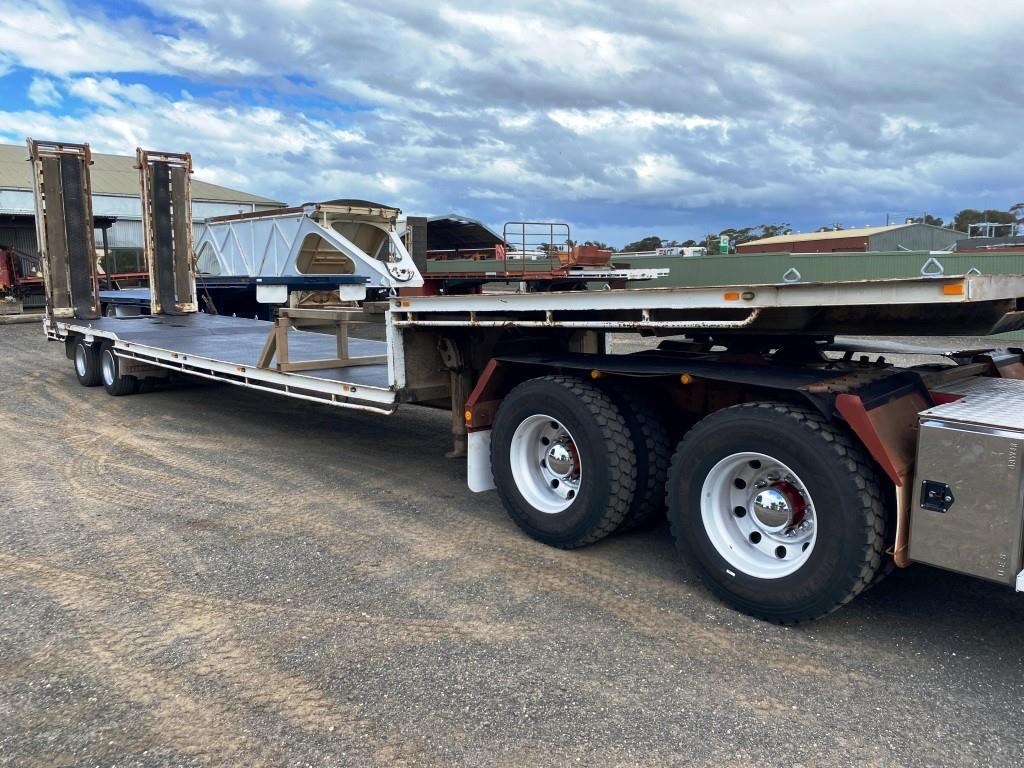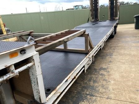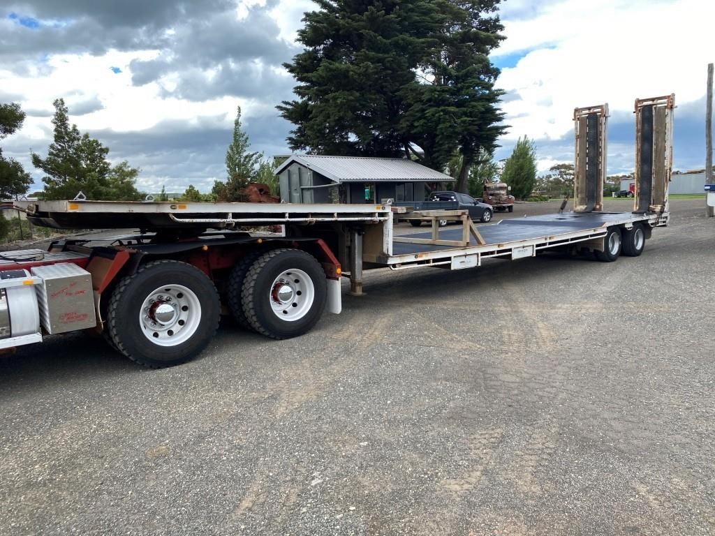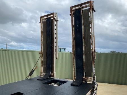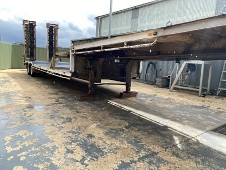 Bogie dropdeck trailer, unknown make, 45 ft long with bi fold ramps & power pack, has ramp frame extensions to top deck.