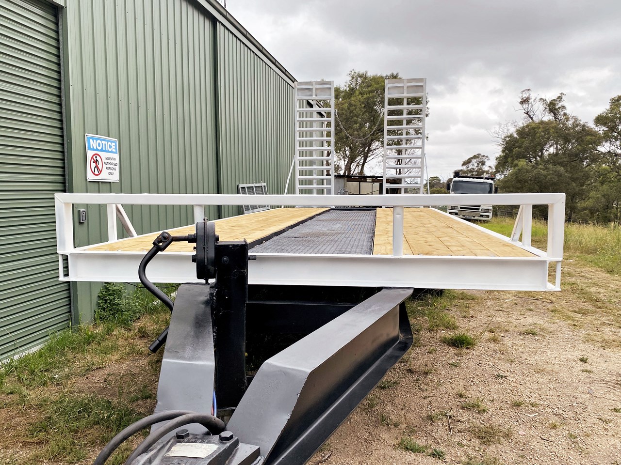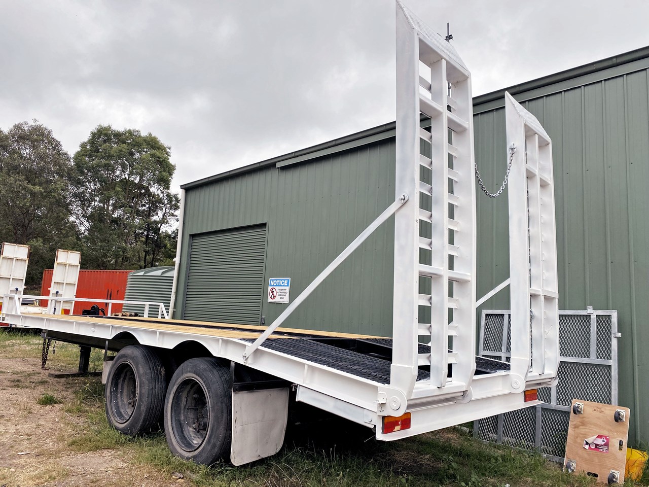 2007 Custom Built, Tandem Axle, Flat Deck, Plant Trailer with Beavertail Ramps. 7.7 Mtrs Long and 2.5 Mtrs Wide. Painted and tidy, new timber tray. Ready to be registered. Can be sold with road worthy certificate with extra cost.