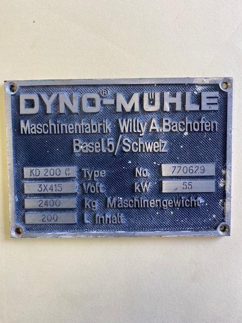 Used Dyno Mill KD200 C Bead Mill. Wet bead mills employ a system to produce fine particles in liquid. As the minute beads inside are agitated at high speed, the machines are capable of producing particles down to the nano size. Stainless steel, jacketed, 200 liter capacity, chamber size 480mm diameter x 1100mm long. 75 hp(55kw), 415V, 1445 rpm drive. Manufacturer: Dyno-Muhle Hydraulic coupler and belt transmission, grinding speed 800 rpm. Overall dimensions: 2500 x 1100 x 2000mm Weight 2400kg