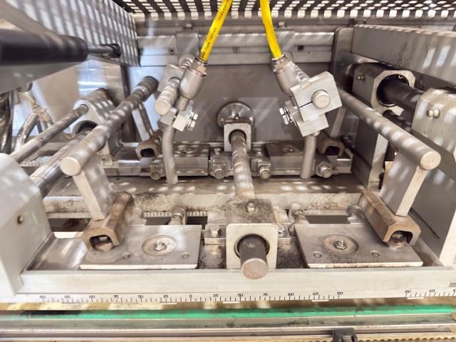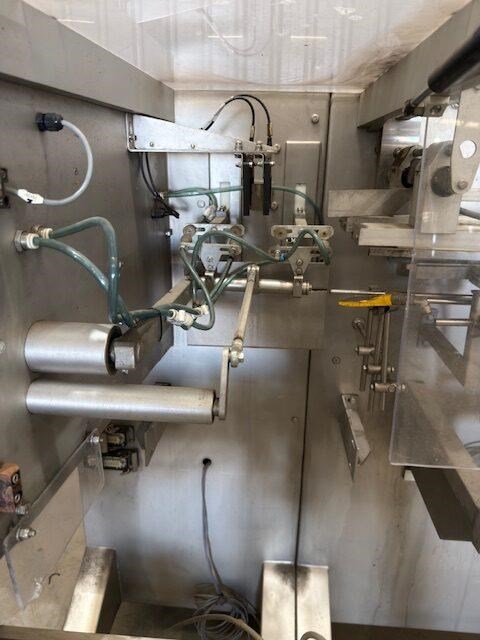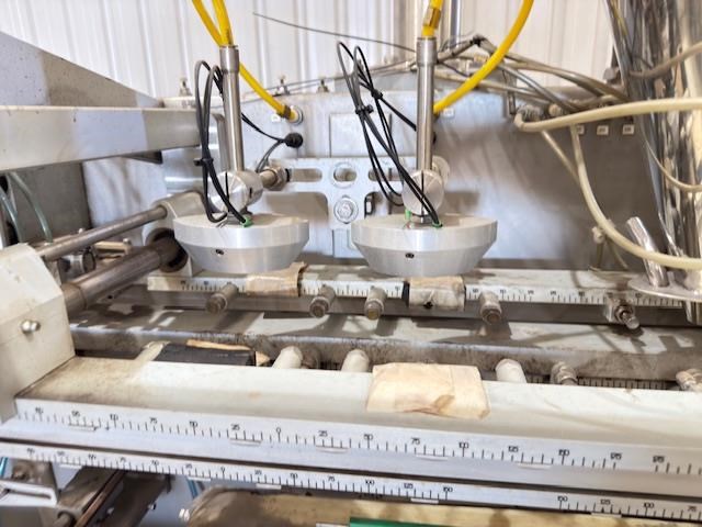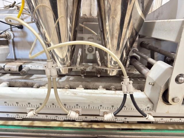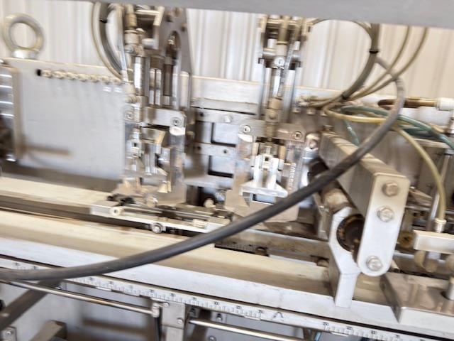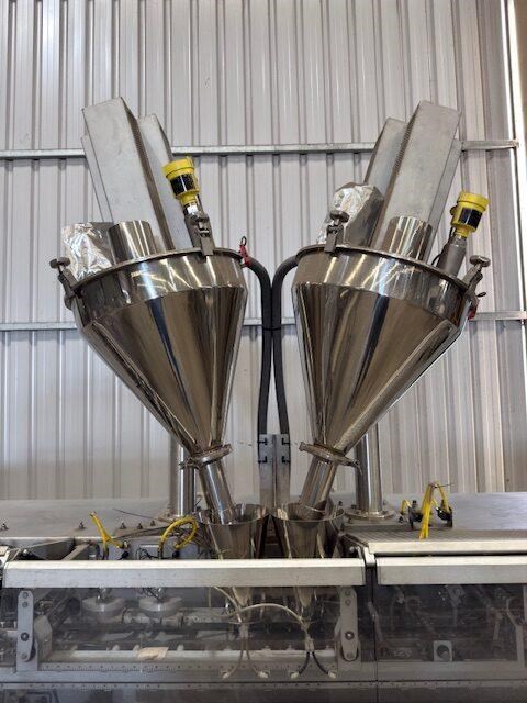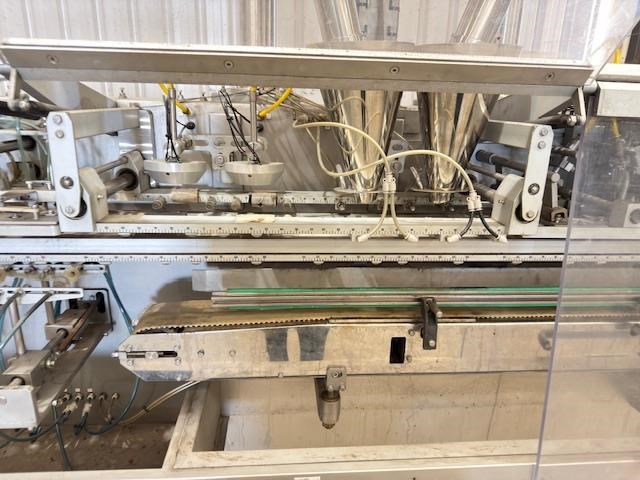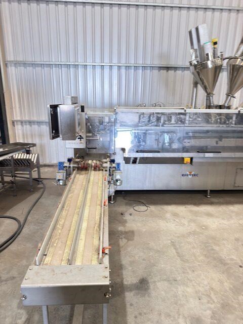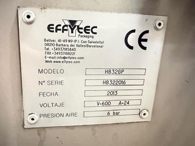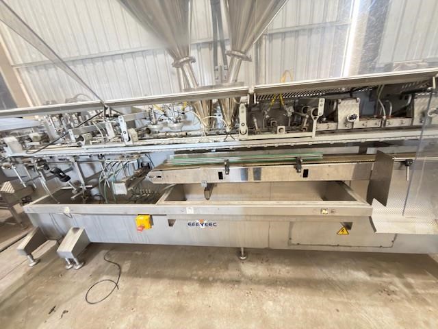 Used Effytec Duplex Premade Pouching Machine HB32GP Model: HB32GP Mfg. Date: 2013 Voltage: 480 Phase: 3 Hz: 50 Amps: 58 Air Pressure: 6 Bar Filling Stations: 2 Max Volume: 500 cc Max Output: 80 cycles/min Power Consumption: 20 kw Air Consumption: 350 l/min General Info: Effytec USA manufactures horizontal form-fill-seal pouch machinery and pre-made pouch fill-seal machinery for packaging all types of products in flat three or four-sided seal sachets, stand-up pouches with re-closable zipper or cap, or shaped pouches for the food, beverage, pharmaceutical, and cosmetic industries. Features: Product: Powder Weight or volume: 40g -300g Pouch style: Flat pre made doy pouch Dimensions requested: 127mm (4.5) x height to be confirmed, maximum 175mm Machine pouch size range (duplex mode) Duplex: Min. 57 x 130 mm Max. 160 x 175 mm Requested Production: 120 - 140ppm (60-70 cycles per minute) Final production will depend on product characteristics, as well as on the volume to be filled. Electrical Data: 480 V / 3 phase / 50Hz Internal & external reel core size: Internal 75mm as standard Filling stations: Two Gas Flushing: Yes