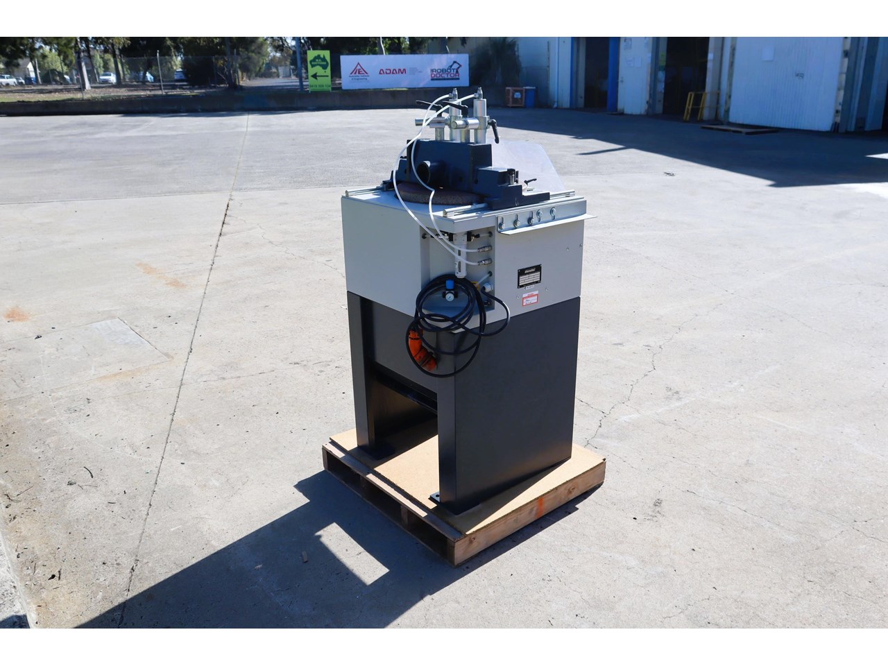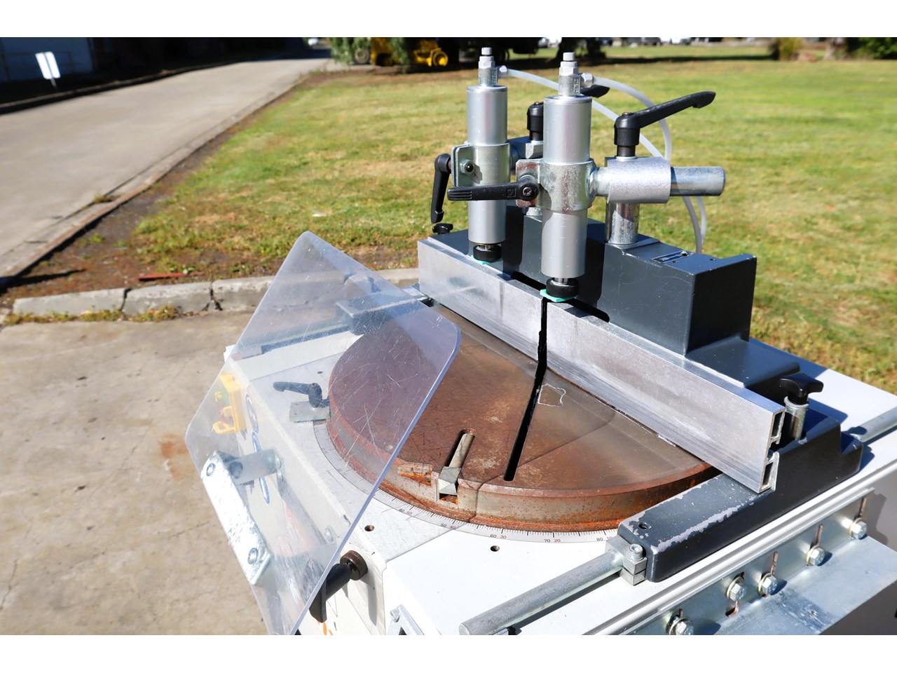 The adjustable mitre table allows accurate angle positioning with clearly marked degree scales, while the dual pneumatic clamps provide secure material holding during operation. A transparent safety guard enhances operator visibility and protection.
