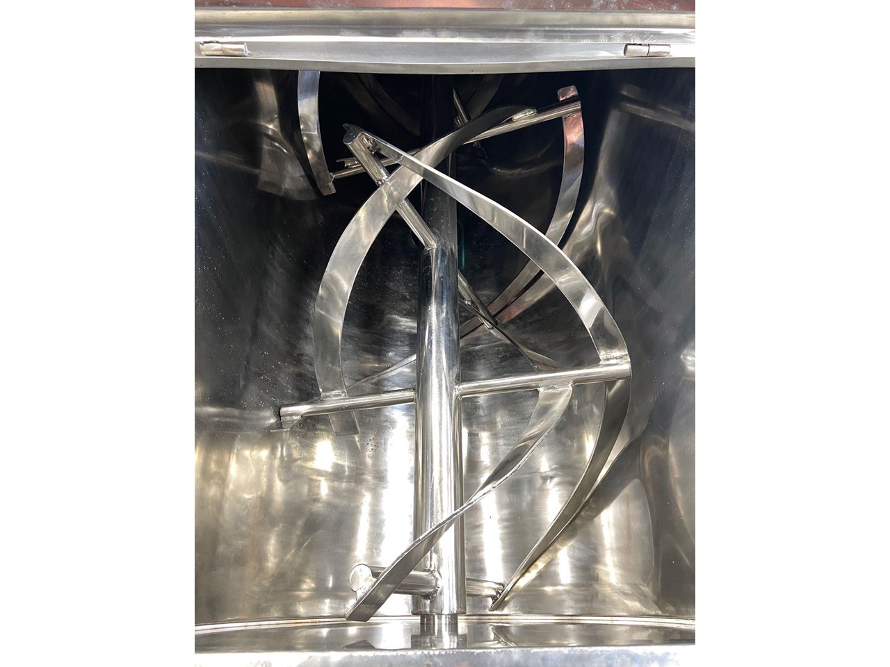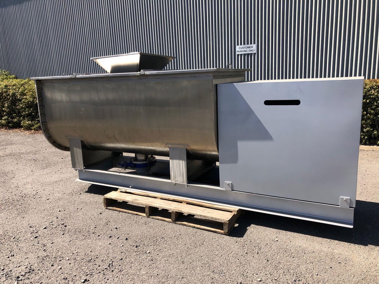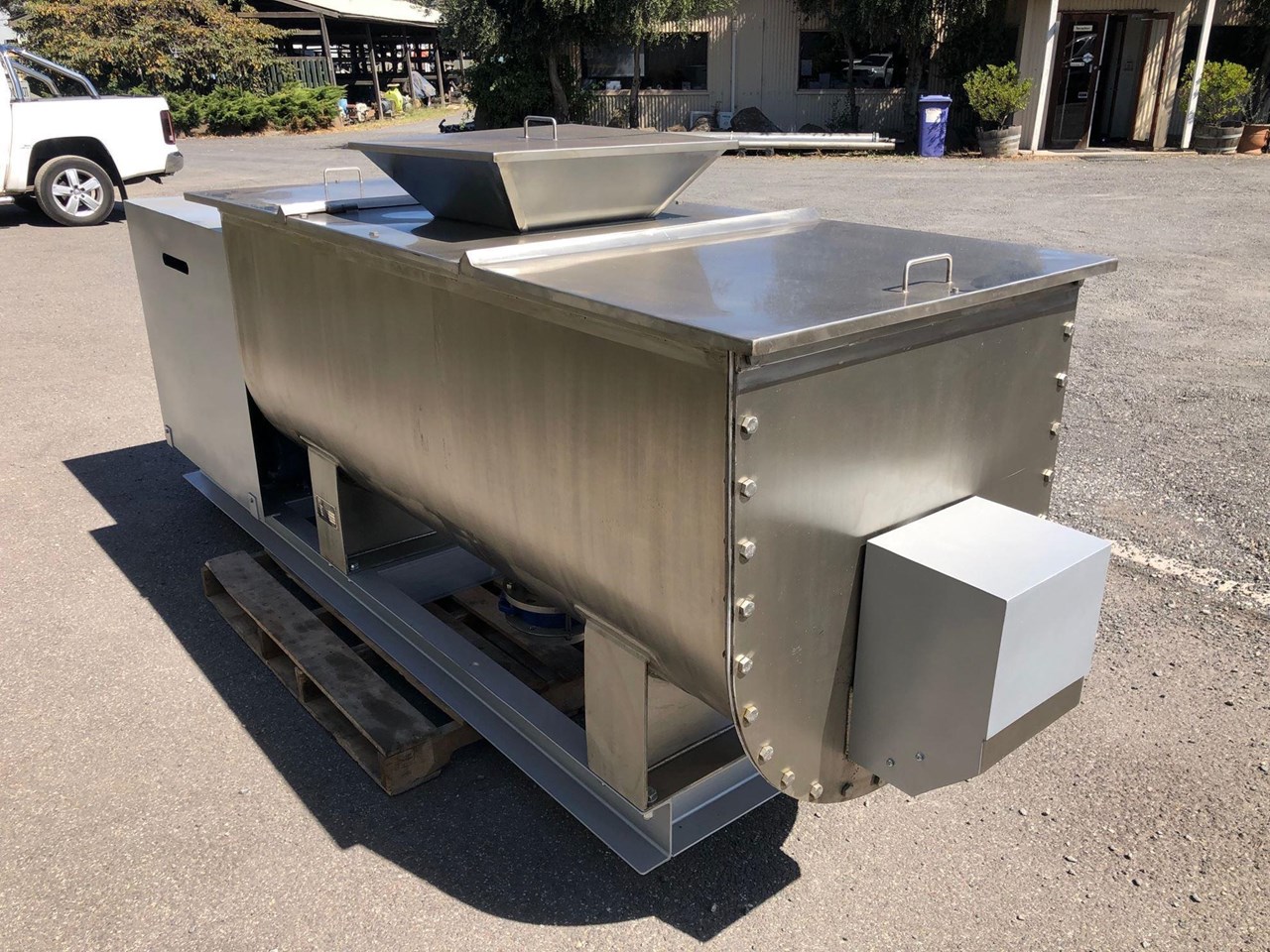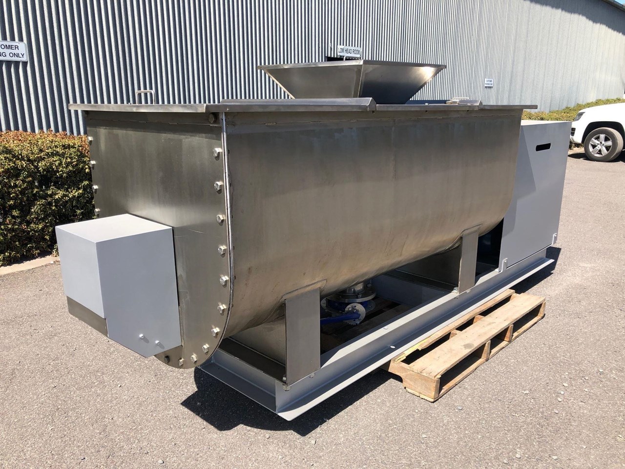 NEW - 1000L Stainless steel ribbon blender. This unit is great for blending dry powders and even slurries. They blend in a cross flow method by moving product in both directions at the same time. Product is fed in the top through a loading hopper, mixed and then discharged out the center bottom outlet. We keep these machines simple and well made to keep the price down. You wont find a more reasonably priced new Stainless steel ribbon blender than you will for one of ours. We have these in stock and they can be inspected at our factory in Melbourne. - Stainless Steel 1000L Ribbon Blender. - Double helix ribbon. - Flanged center outlet. - Complete with 7.5kw(415V) drive and gearbox, provides a final drive speed of 22rpm. Blender is supplied with motor and gearbox fitted but no electrical controls. Ideal for mixing powders and granules. Packed gland seals at either end of the shaft and the centre bottom outlet is fitted with a butterfly valve. Overall dimensions: 3.3m long x 850mm wide x 1350mm high.