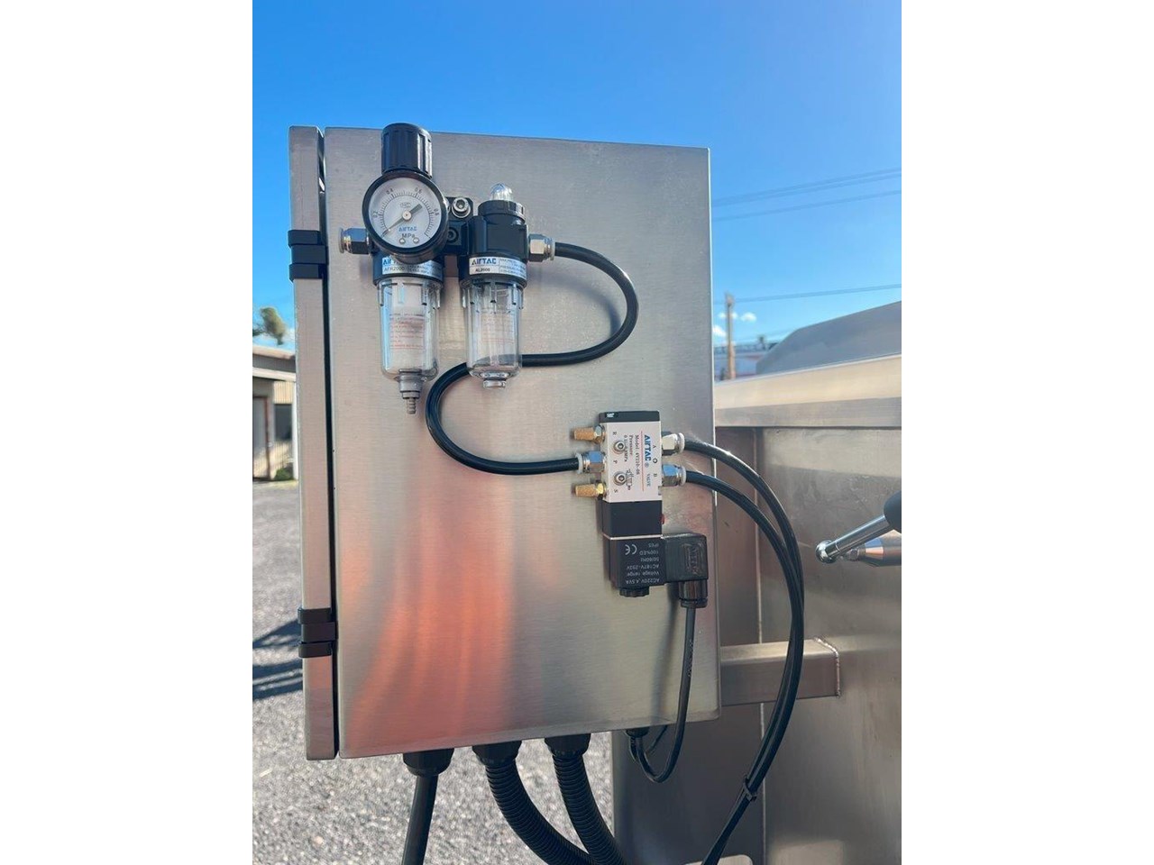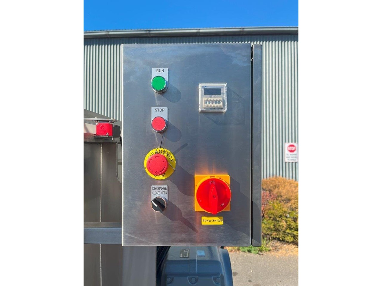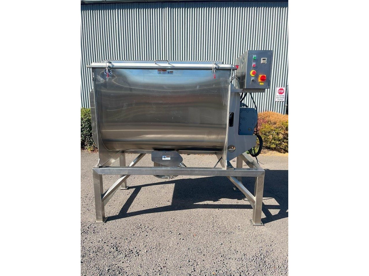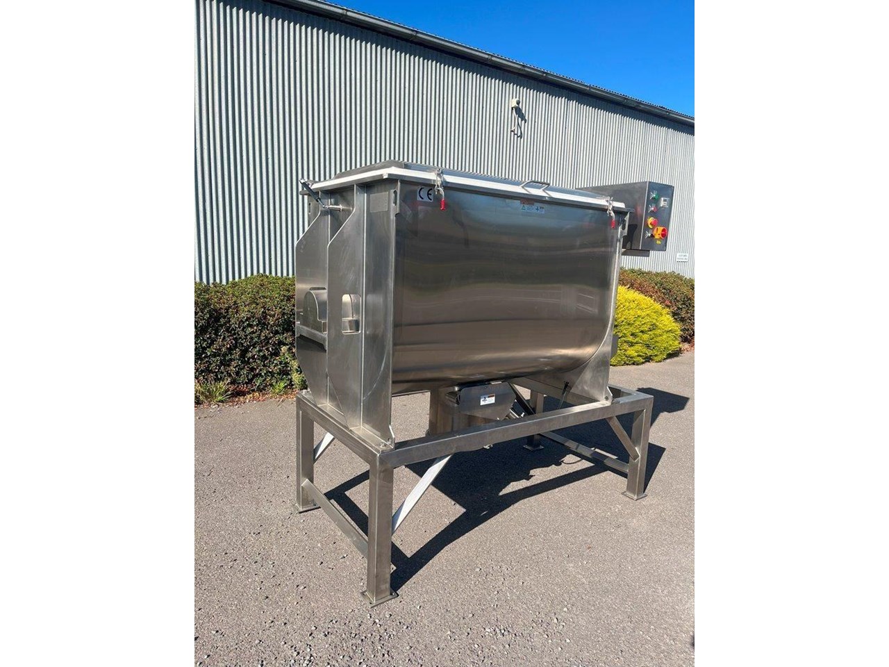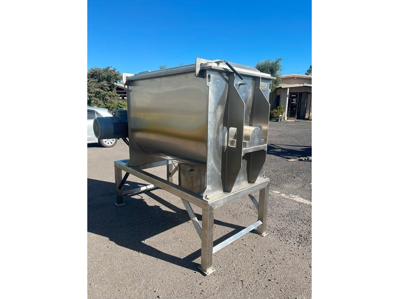 NEW - 1000L Stainless steel ribbon blender with double helix ribbon for more efficient mixing. Ribbon blenders are versatile and can handle a variety of materials, making them suitable for many industries: Food Industry - Mixing dry ingredients like flour, spices, and baking mixes. Coating particles with oils or flavorings. Pharmaceuticals - Blending powdered medications. Creating homogenous mixtures of active ingredients and excipients. Chemicals - Combining chemicals in powder form. Mixing additives and raw materials for chemical production. Construction - Mixing cement, plaster, and other building materials. Preparing dry mixes for construction applications. Specifications of the F.A Maker 1000L ribbon blender: - Max working volume 1000 Litres - Total volume 1250 Litres - Made from 304 Stainless Steel - Pneumatic Discharge Valve, clearance from outlet to ground is 800mm or 980mm with casters installed. - 11kW Drive, 415V - Batch run timer control - Hinged lid with automatic gas struts to hold lid. - Grated mesh for loading - Fully stainless frame - Heavy duty casters Overall Dimensions (L) 2150mm (W) 1300mm (H) 2020mm Internal Bowl Dims: (L) 1490mm (W) 890mm x (H) 1050mm Outlet Spool Height from floor: 440mm or 620mm with casters installed. Spool Diameter: 350mm Discharge Valve Diameter: 190mm Current lead time 8-10 weeks Also available in 100, 200, 300, 500 and 1500 Litre.