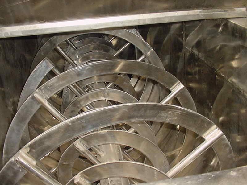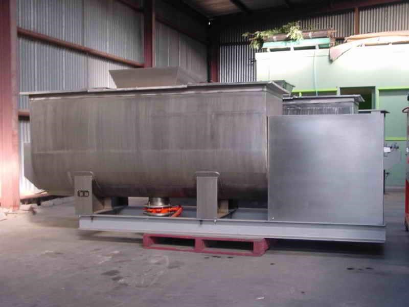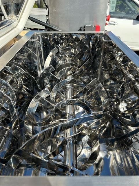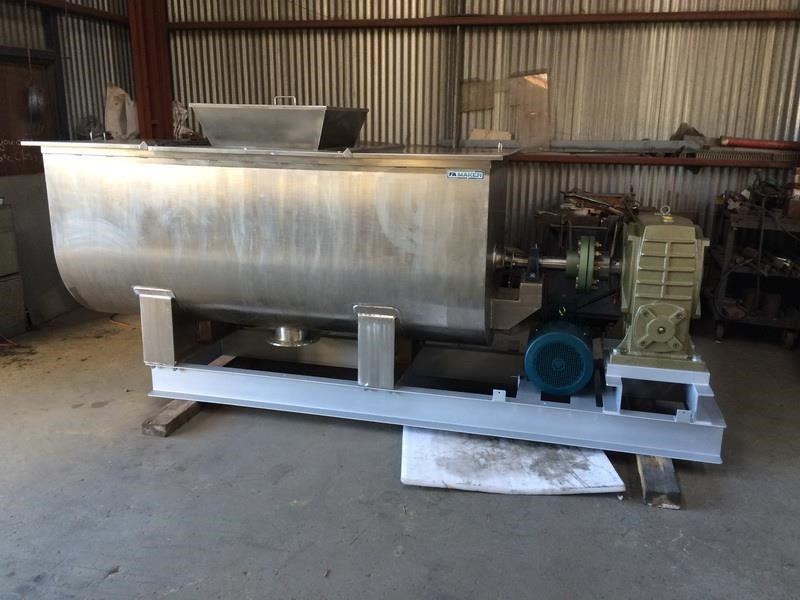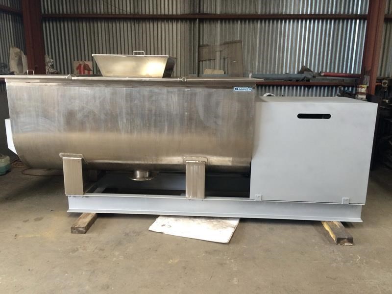 Stainless Steel 2000L Ribbon Blender. Double helix ribbon at 30rpm, 200mm flanged center outlet with butterfly valve. Fitted with 15kW drive and gearbox to suit. Central loading hopper with mesh grate and hinged lids on either side for cleaning. Suitable for mixing a range of dry powders in a short amount of time. These blenders are built to order, current lead time is 10-12 weeks.