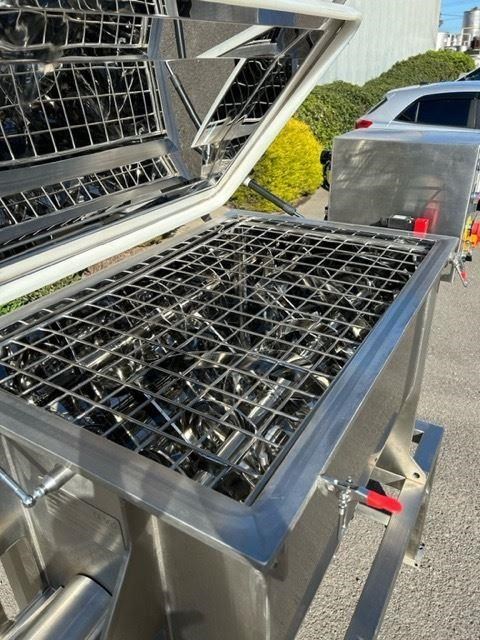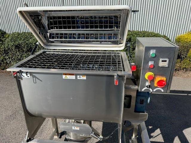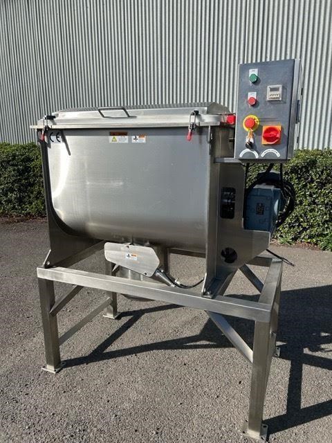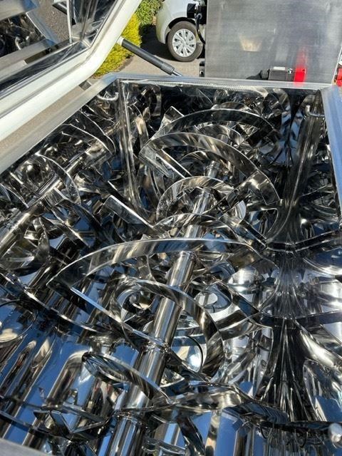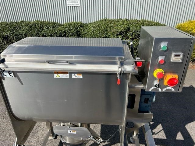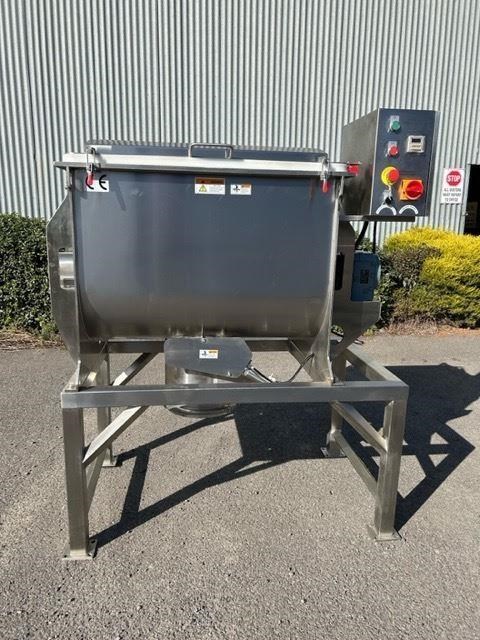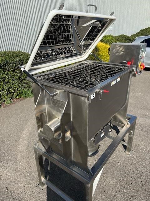 NEW - 200L Stainless steel ribbon blender with double helix ribbon for more efficient mixing. Ribbon blenders are versatile and can handle a variety of materials, making them suitable for many industries: Food Industry - Mixing dry ingredients like flour, spices, and baking mixes. Coating particles with oils or flavorings. Pharmaceuticals - Blending powdered medications. Creating homogenous mixtures of active ingredients and excipients. Chemicals - Combining chemicals in powder form. Mixing additives and raw materials for chemical production. Construction - Mixing cement, plaster, and other building materials. Preparing dry mixes for construction applications. Specifications of the F.A Maker 200L ribbon blender: - Max working volume 200L. - Total volume 250L. - Made from 304 Stainless Steel. - Pneumatic Discharge Valve, clearance from outlet to ground is 650mm. - 4.0kW Drive, 415V. - Batch run timer control. - Hinged lid with automatic gas struts to hold lid. - Safety switch on the lid. - Grated mesh for loading. - Fully stainless frame. - Heavy duty caster wheels. Overall Dimensions (L) 1400mm (W) 900mm (H) 1650mm. Internal Bowl Dims: (L) 900mm (W) 550mm x (Depth) 650mm. Outlet Discharge Height from floor: 650mm. Outlet Diameter: 150mm. Also available in 100, 300, 500, 1000 and 1500 litre.
