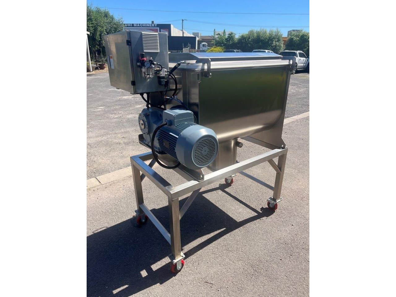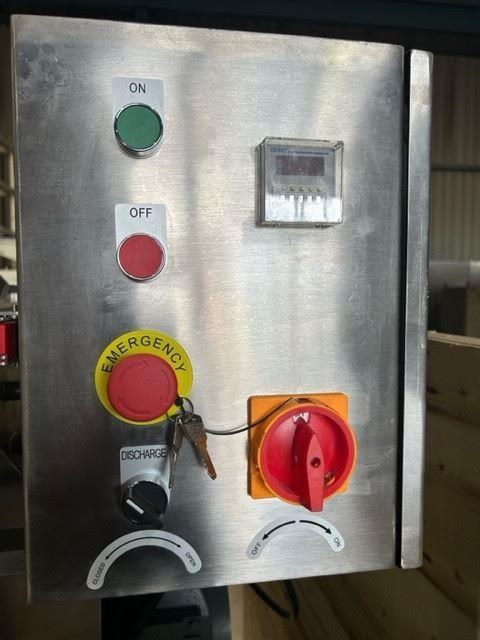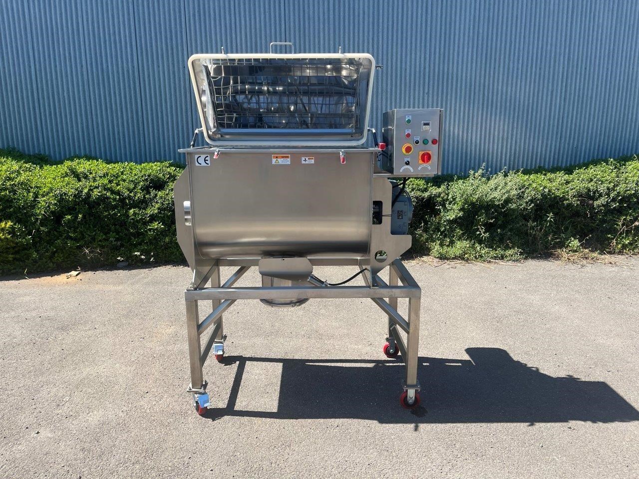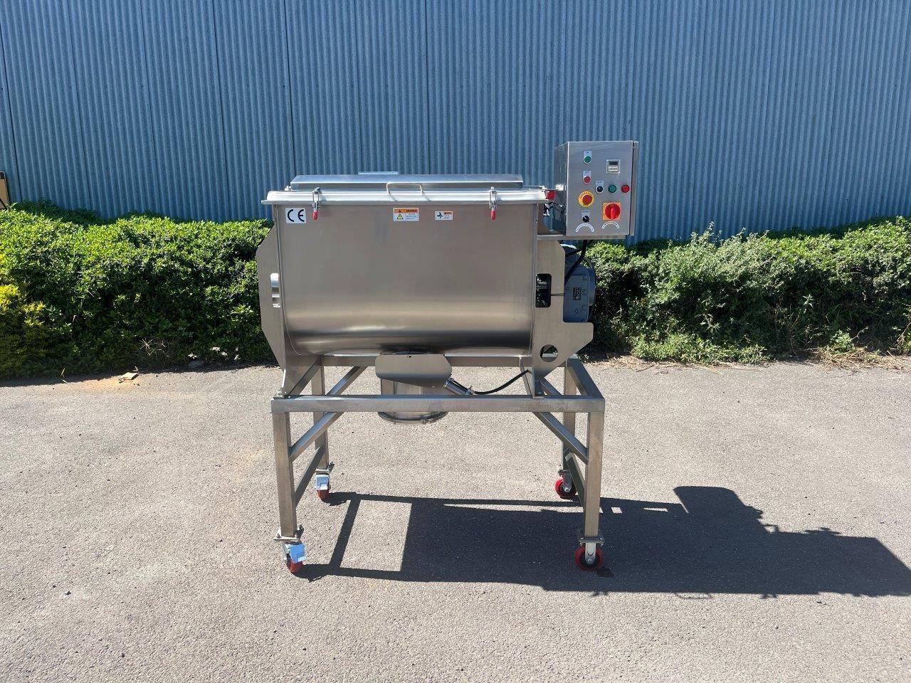 NEW - 300L Stainless steel ribbon blender with double helix ribbon for more efficient mixing. Ribbon blenders are versatile and can handle a variety of materials, making them suitable for many industries: Food Industry - Mixing dry ingredients like flour, spices, and baking mixes. Coating particles with oils or flavorings. Pharmaceuticals - Blending powdered medications. Creating homogenous mixtures of active ingredients and excipients. Chemicals - Combining chemicals in powder form. Mixing additives and raw materials for chemical production. Construction - Mixing cement, plaster, and other building materials. Preparing dry mixes for construction applications. Specifications of the F.A Maker 300L ribbon blender: - Max working volume 300L - Total volume 375L - Made from 304 Stainless Steel - Pneumatic Discharge Valve, clearance from outlet to ground is 600mm - 5.5kW Drive, 415V - Batch run timer control - Hinged lid with automatic gas struts to hold lid. - Grated mesh for loading - Fully stainless frame - Heavy duty casters - Current lead time 8-10 weeks Overall Dimensions (L) 1500mm (W) 1100mm (H) 1830mm Internal Bowl Dims: (L) 1040mm (W) 615mm x (H) 698mm Outlet Spool Height from floor: 595mm Spool Diameter: 300mm Discharge Valve Diameter: 170mm Also available in 100, 200, 500, 1000 and 1500 Litre.