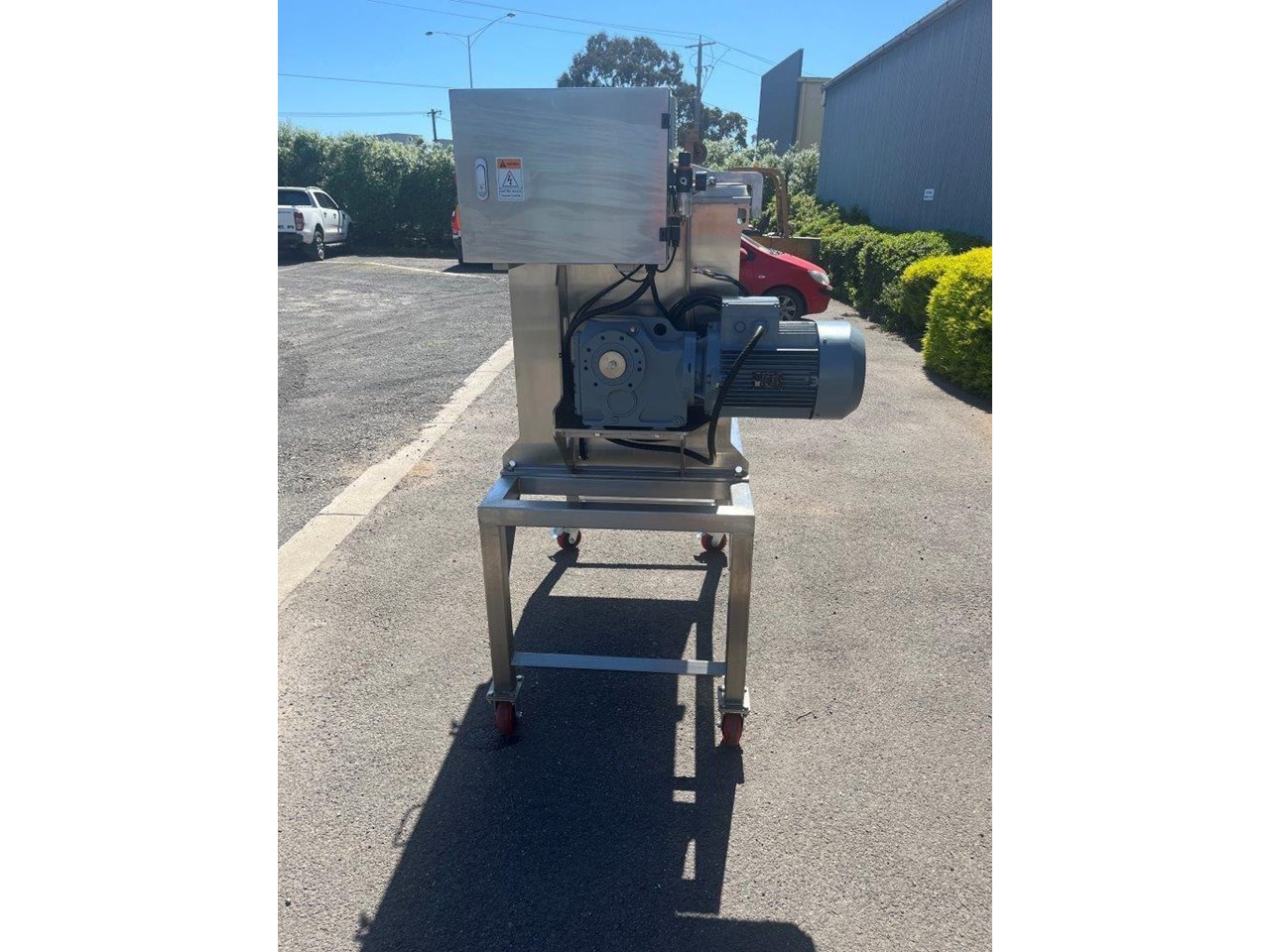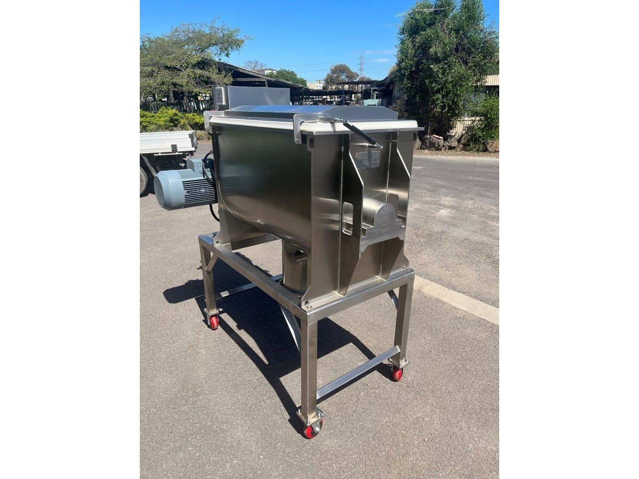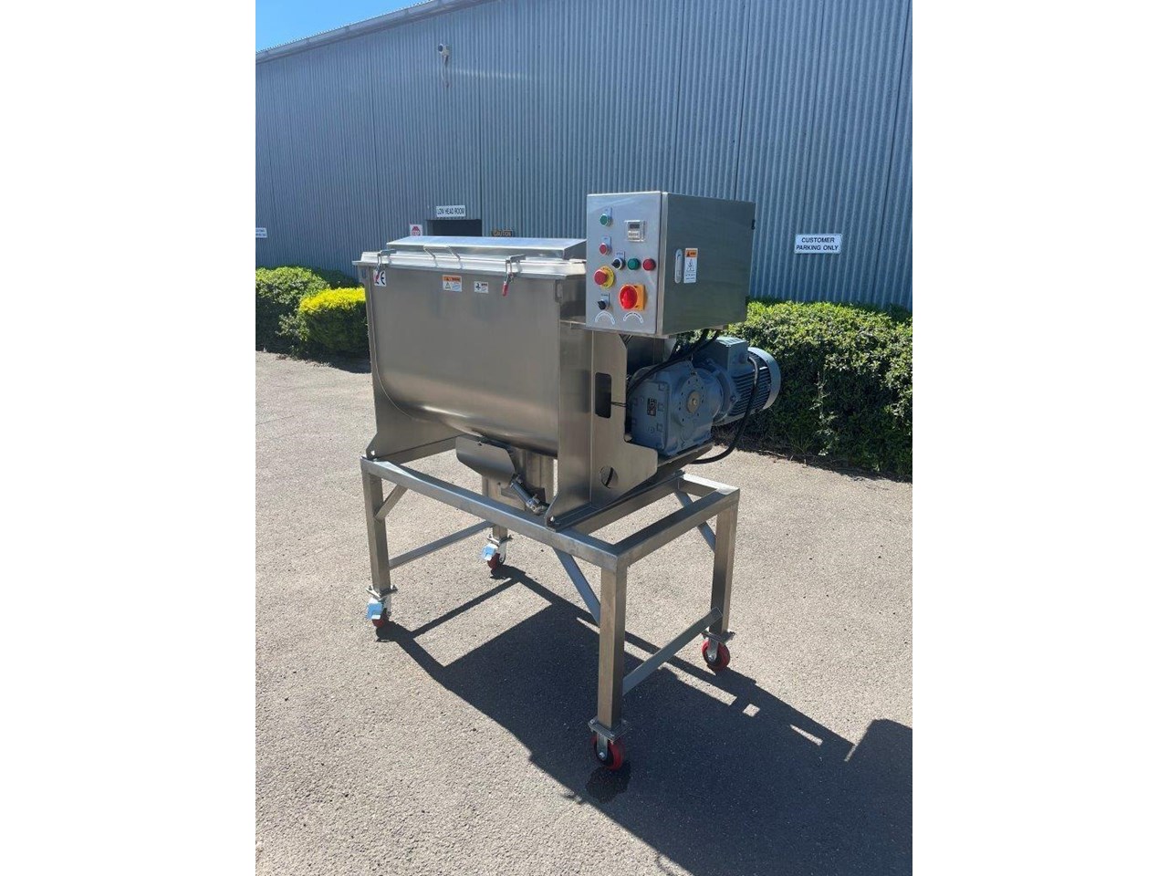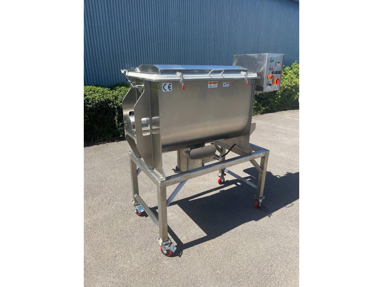 NEW - 300L Stainless steel ribbon blender with double helix ribbon for more efficient mixing. Ribbon blenders are versatile and can handle a variety of materials, making them suitable for many industries: Food Industry - Mixing dry ingredients like flour, spices, and baking mixes. Coating particles with oils or flavorings. Pharmaceuticals - Blending powdered medications. Creating homogenous mixtures of active ingredients and excipients. Chemicals - Combining chemicals in powder form. Mixing additives and raw materials for chemical production. Construction - Mixing cement, plaster, and other building materials. Preparing dry mixes for construction applications. Specifications of the F.A Maker 300L ribbon blender: - Max working volume 300L - Total volume 375L - Made from 304 Stainless Steel - Pneumatic Discharge Valve, clearance from outlet to ground is 600mm - 5.5kW Drive, 415V - Batch run timer control - Hinged lid with automatic gas struts to hold lid. - Grated mesh for loading - Fully stainless frame - Heavy duty casters - Current lead time 8-10 weeks Overall Dimensions (L) 1500mm (W) 1100mm (H) 1830mm Internal Bowl Dims: (L) 1040mm (W) 615mm x (H) 698mm Outlet Spool Height from floor: 595mm Spool Diameter: 300mm Discharge Valve Diameter: 170mm Also available in 100, 200, 500, 1000 and 1500 Litre.