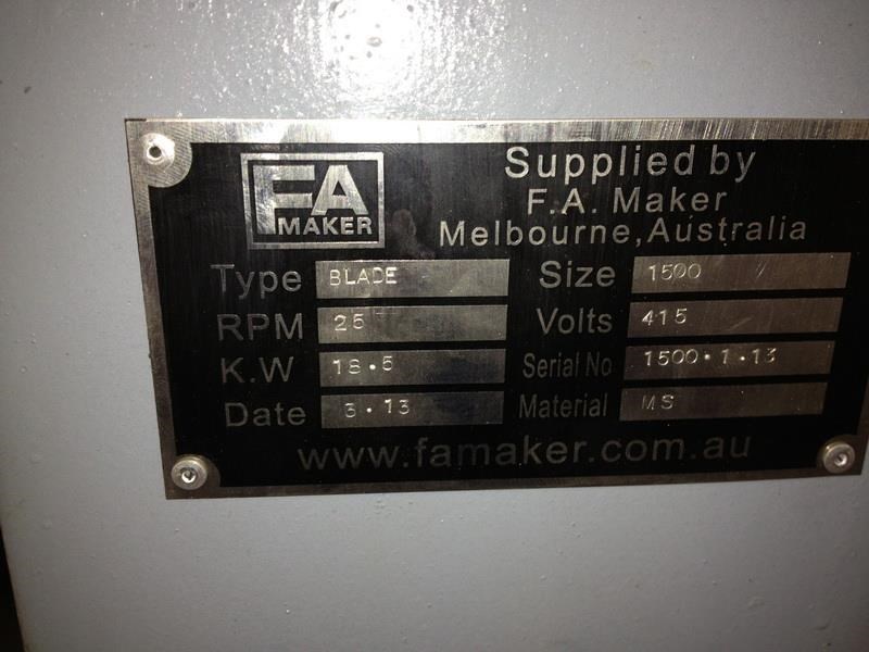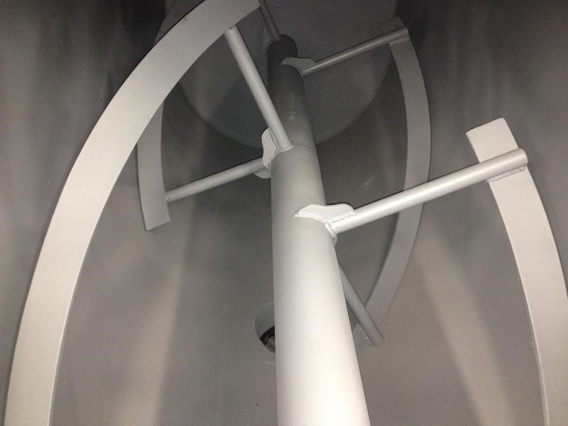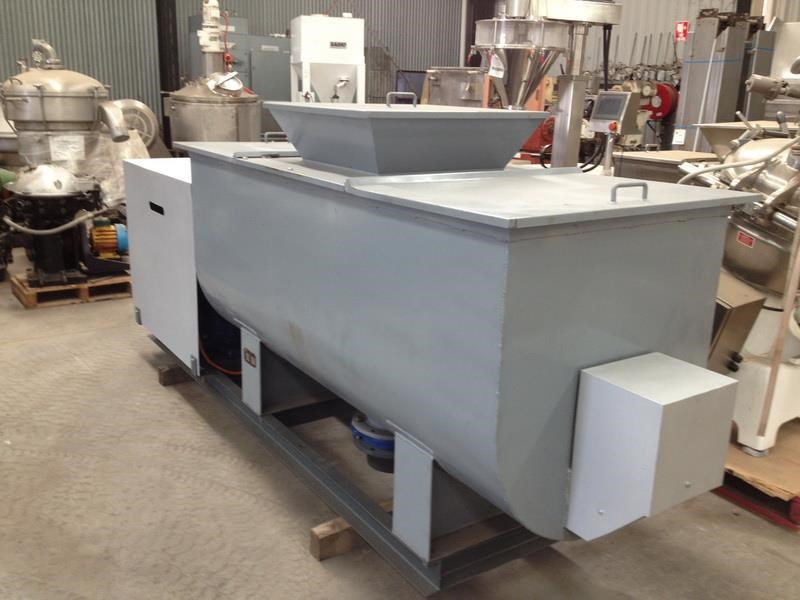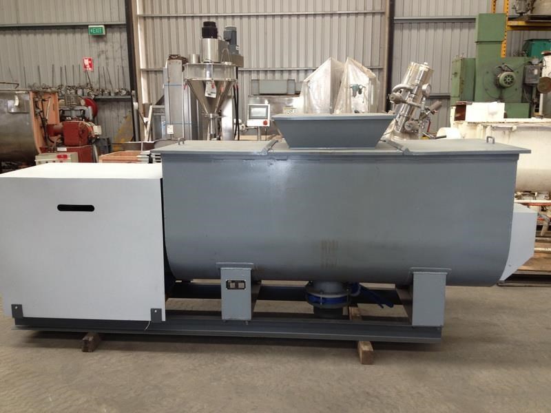 Mild Steel 1500L Blender, with blade design. The blade design has 4 sets of blades internally which move the product in opposite directions. This design is very efficient and provides an excellent mix. The benefit of this design is that it is much easier to clean over the double helix design. This blender has a central loading hopper ontop and well and two hinged access doors for easy access inside the blender. It has a central bottom outlet which is 250mm in dia with a butterfly valve installed. There is a 15kw, 415V electric motor belt driving a gearbox that turns the shaft at approx 20rpm. The end bearings are mounted externally behind packed glands to protect them from any product that is being mixed. This type of blender is an excellent machine to mix dry powders, grains and other materials. They can also be used to mix wet materials such as render. We can also supply this blender is st/steel 304 or 316. This blender is built to order, lead time 8-10 weeks.