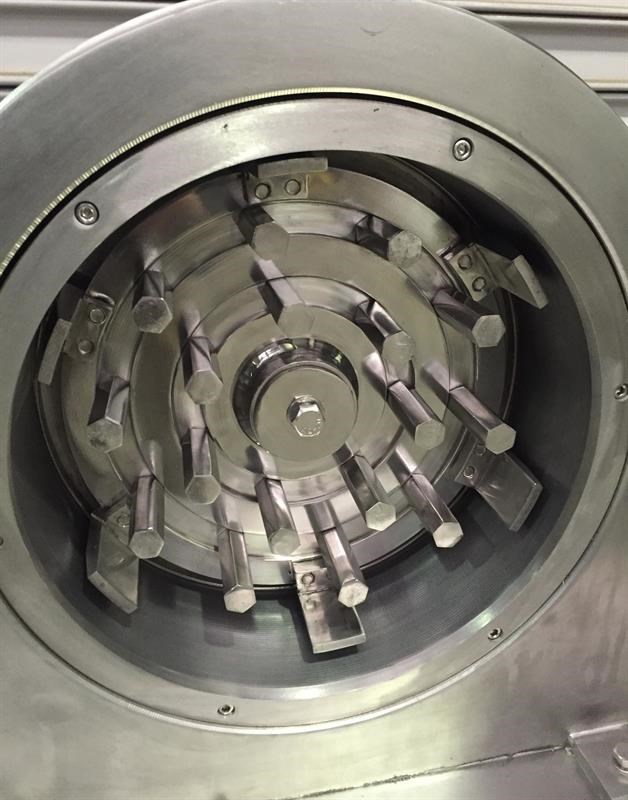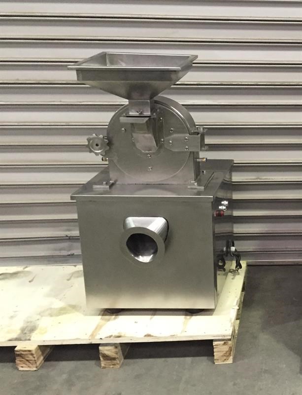 NEW - Stainless steel pin mill Model: 20B Product is fed via the hopper then milled internally and discharged out the front of the machine. The feed rate can be regulated via a sliding gate and the internal mesh screens can be changed to suit your product. Jacketed bearing housing to help keep the mill bearings cool during prolonged running periods. Capacity: up to 150kg/hr Screen sizes: 0.5mm, 1.0mm, 1.5mm or 2mm(custom sizes can be made) (Comes with one screen fitted) others can be purchased. 3kw 415V Drive motor.