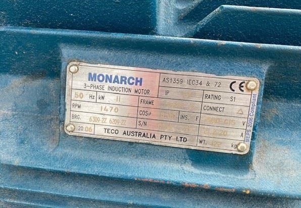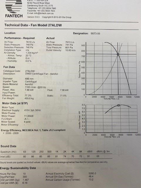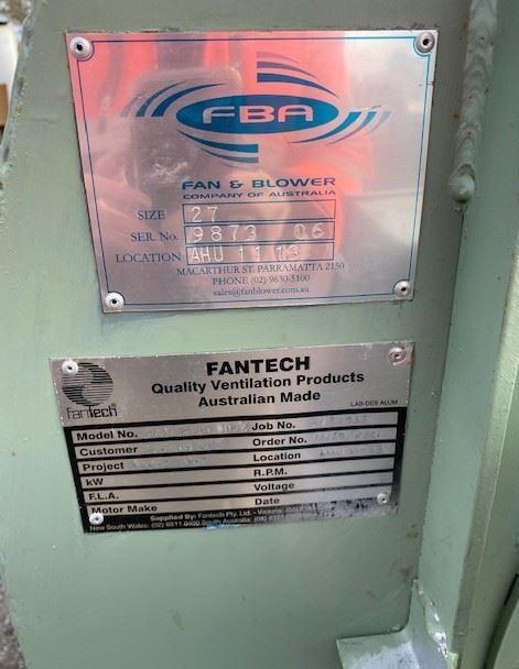 Fantech Air Fan. 11 kw 27 inch dual inlet. Air Flow: 7613 L/Sec Static Pressure: 741 PA Total Pressure: 801 PA Outlet Velocity: 10 m/s
