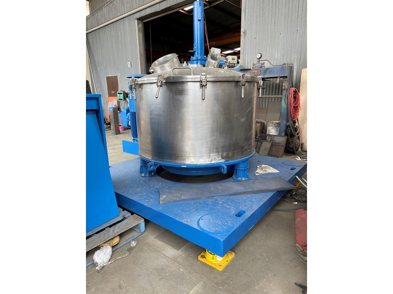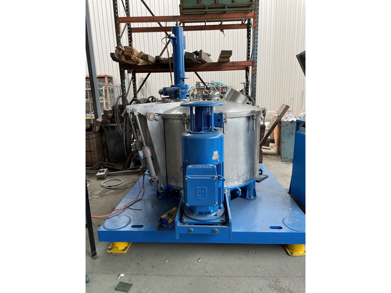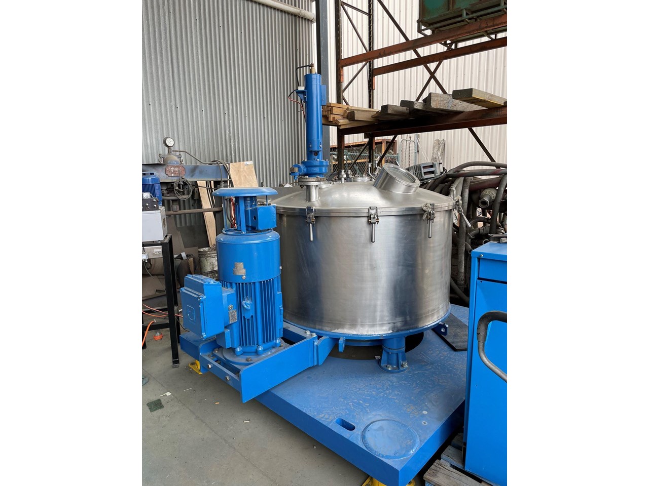 The vertical basket centrifuges of the type DZF Pull Action Filter centrifuges are designed for different applications in solid-liquid separation. The discharge system is a Ferrum innovation (patented) and functions without using a scraper knife. Vertical Ferrum DSZ Basket centrifuge with a max bowl speed of 950 RPM, bottom discharge, gastight, 2.47 m2 filtration area, 500 kg max load,built in a sanitary design. 22 KW motor 460/3/60/1750 RPM, pneumatic heel cake removal feature, hydraulic power pack for lid lifting. Prior use: Pharmaceutical. Excellent condition. Features Discharging without scraper knife Gentle product treatment - no crystal breakage No residual heel since this is also removed by stretching the filter cloth The filter cloth is only stretched for discharging, not inverted. Therefore, the mechanical strain of the filter cloth is comparatively small. The discharge sequence is carried out within the basket. For this reason, the centrifuge housing remains free from centrifuged product. The dimensions and the weight of the Pull Action Filter centrifuge are significantly smaller than for a comparable horizontal filter centrifuge. The Pull Action Filter centrifuge is less expensive than a comparable horizontal centrifuge with inverting filter cloth mechanism. Suitable for potentially explosive areas according to directive 2014/34/EU (ATEX)
