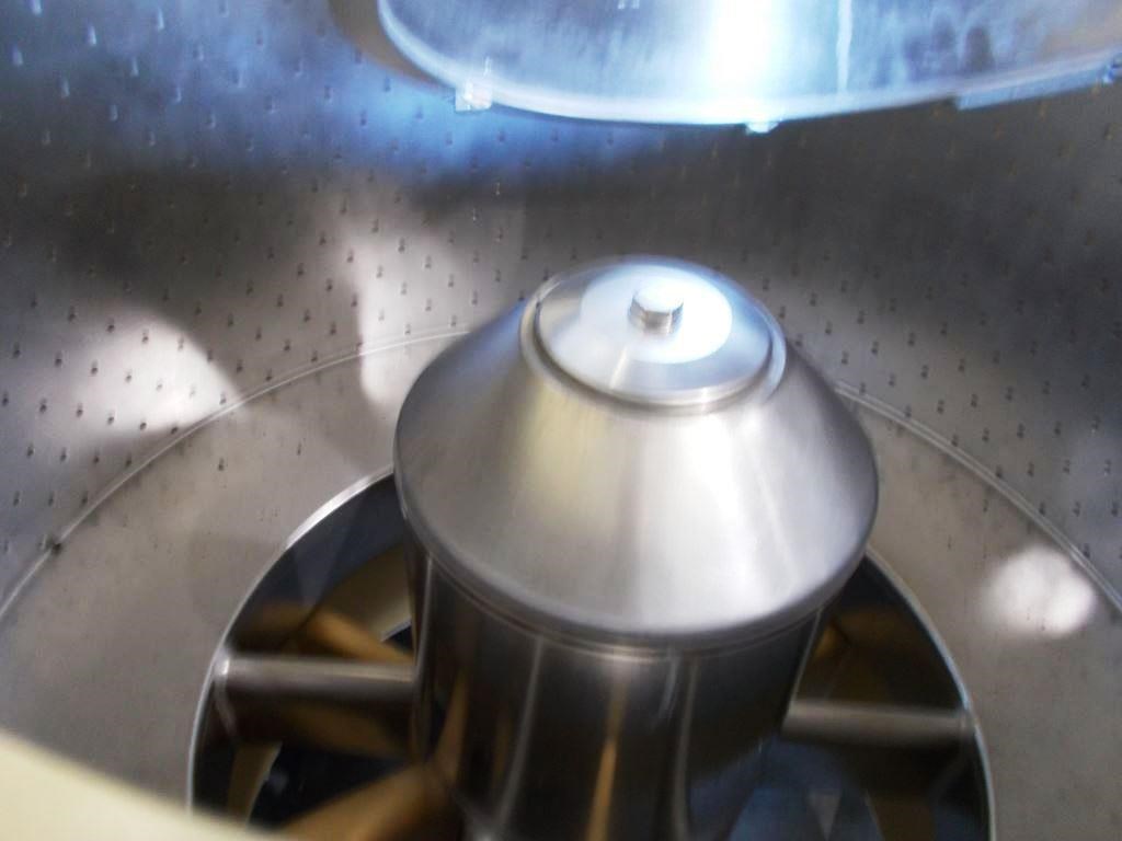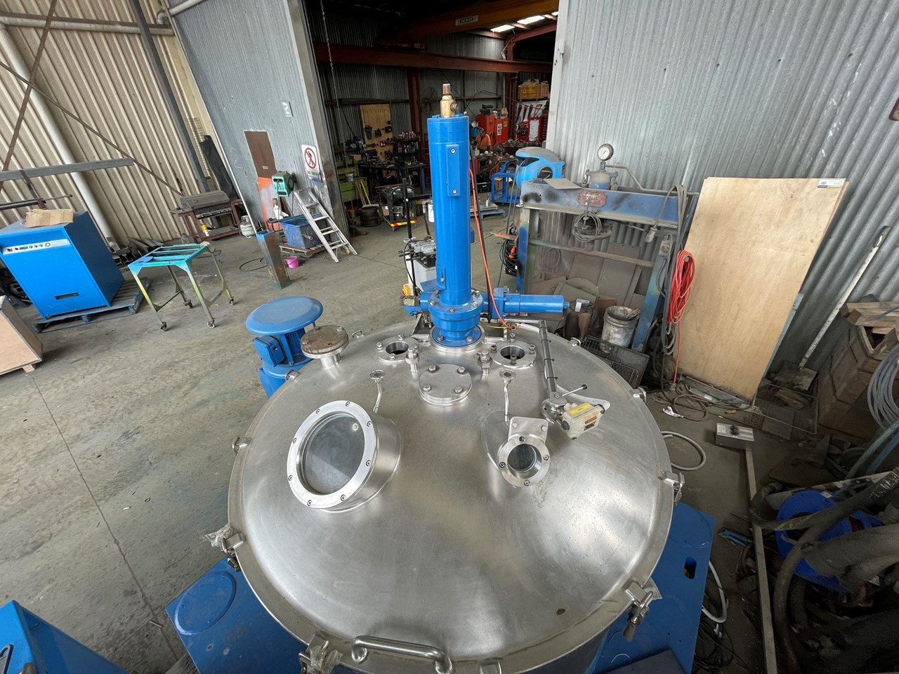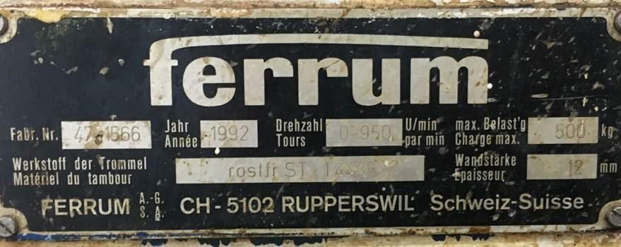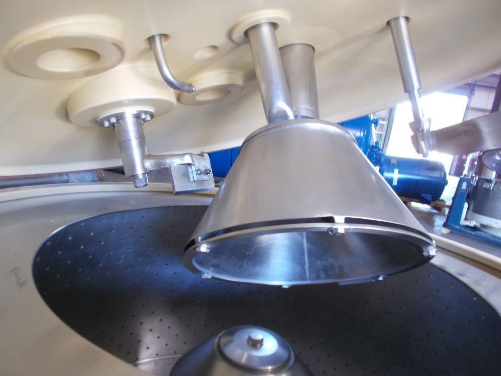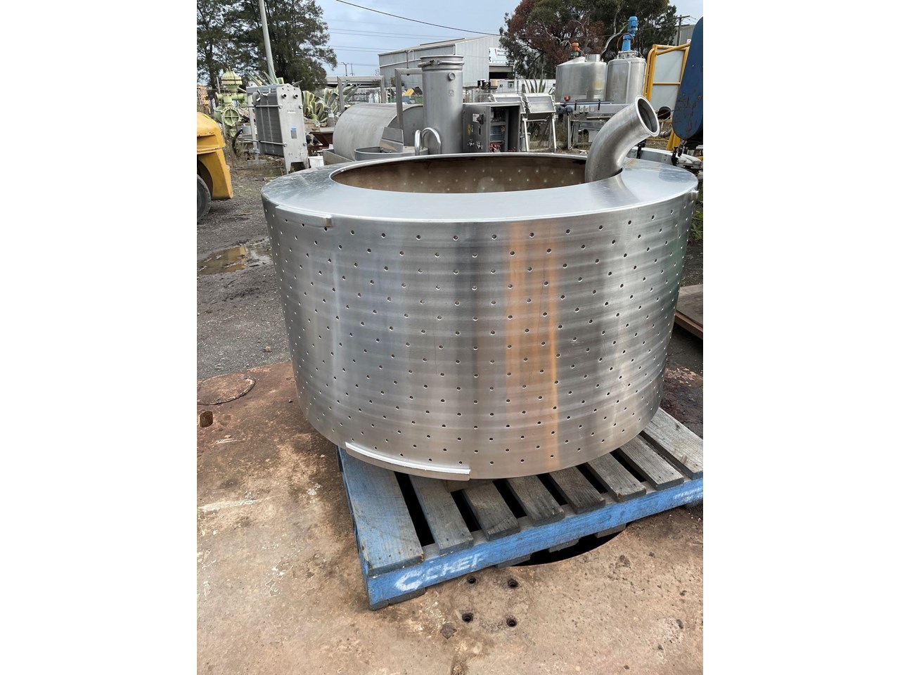 The vertical basket centrifuges of the type DZF Pull Action Filter centrifuges are designed for different applications in solid-liquid separation. The discharge system is a Ferrum innovation (patented) and functions without using a scraper knife. Vertical Ferrum DSZ Basket centrifuge with a max bowl speed of 950 RPM, bottom discharge, gastight, 2.47 m2 filtration area, 500 kg max load,built in a sanitary design. 22 KW motor 460/3/60/1750 RPM, pneumatic heel cake removal feature, hydraulic power pack for lid lifting. Prior use: Pharmaceutical. Excellent condition. Features Discharging without scraper knife Gentle product treatment - no crystal breakage No residual heel since this is also removed by stretching the filter cloth The filter cloth is only stretched for discharging, not inverted. Therefore, the mechanical strain of the filter cloth is comparatively small. The discharge sequence is carried out within the basket. For this reason, the centrifuge housing remains free from centrifuged product. The dimensions and the weight of the Pull Action Filter centrifuge are significantly smaller than for a comparable horizontal filter centrifuge. The Pull Action Filter centrifuge is less expensive than a comparable horizontal centrifuge with inverting filter cloth mechanism. Suitable for potentially explosive areas according to directive 2014/34/EU (ATEX)