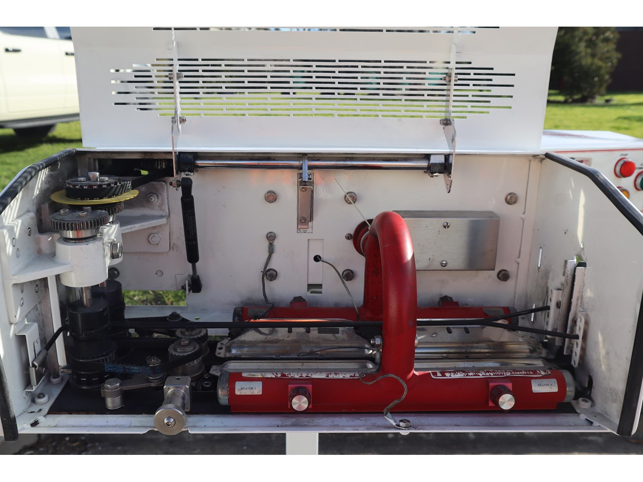 Hot air sealing system is in good condition. It's used to seal a wide variety of heat-sealable, pillow-style plastic bags. Particularly great for sealing bags in commonly used in food production and distribution lines.
