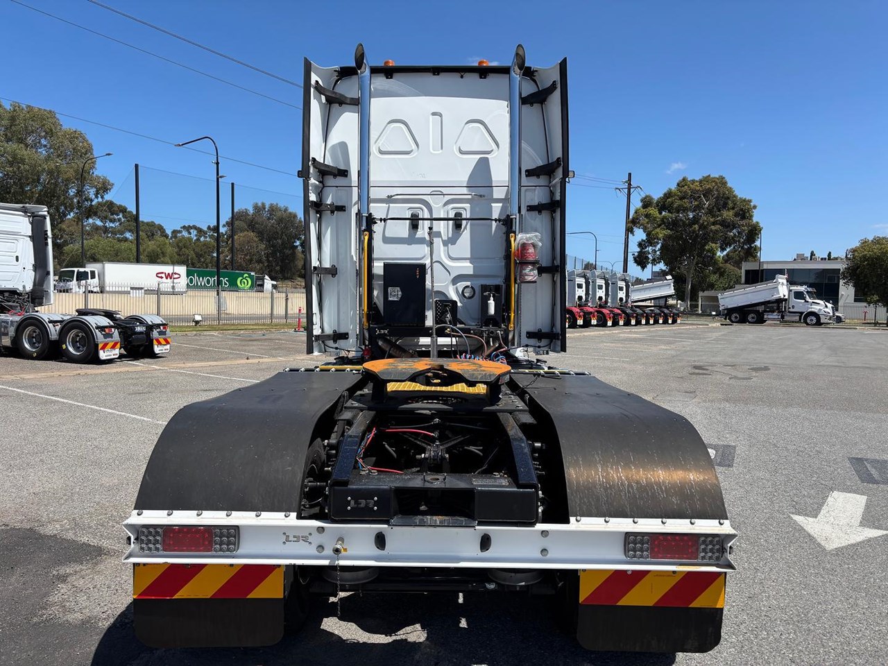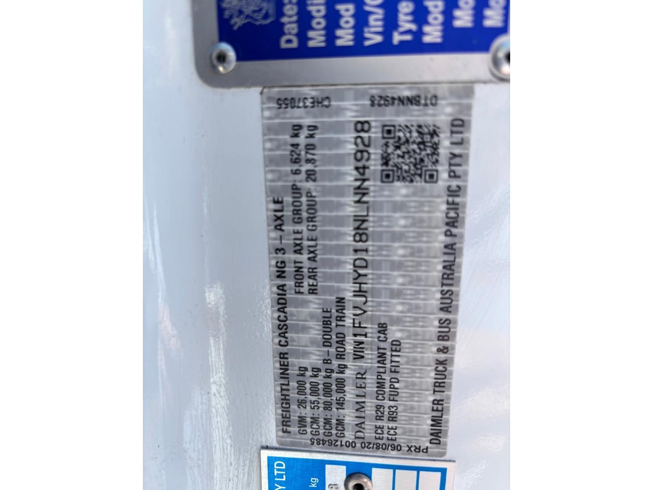 2021 Freightliner Cascadia 126 145000kg road train prime mover, Detroit DD16 600hp engine, Eaton 18 speed Roadranger manual transmission, Spicer R52-160 drive axles on Neway air bag suspension, alloy bull bar, 60" integrated sleeper with dual bunks, Dometic draw fridge, Bushman upright fridge, UHF, Icepack air conditioner, 50mm K Hitch fixed turntable, conveyor guards, water tank, tool box, lockable isolation switch, In excellent condition ex major fleet and has been maintained by Velocity on a service & maintenance plan. low km and ready to go