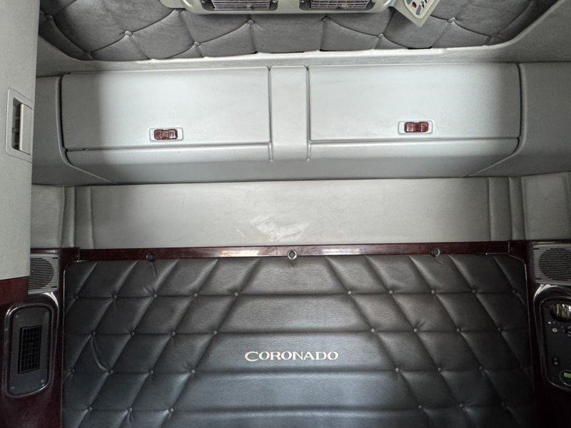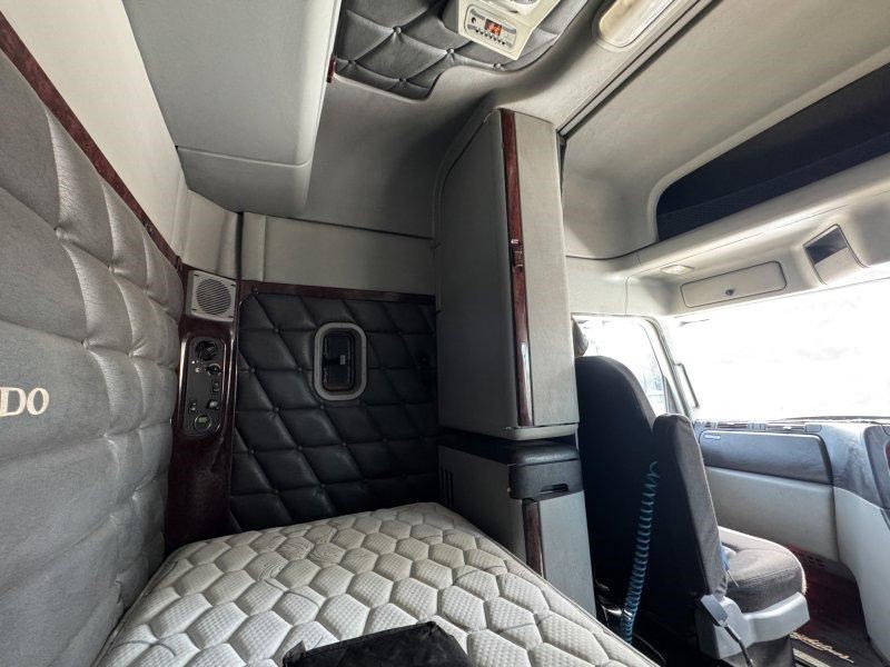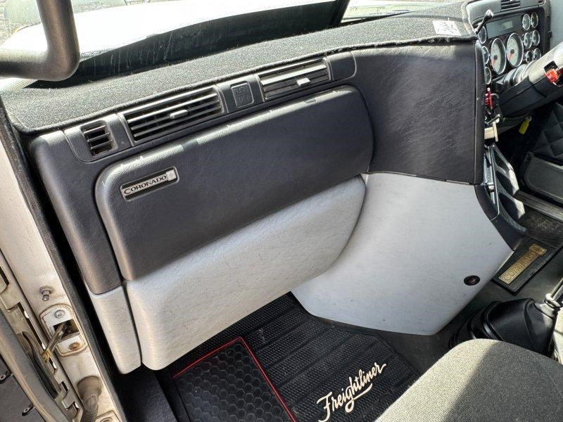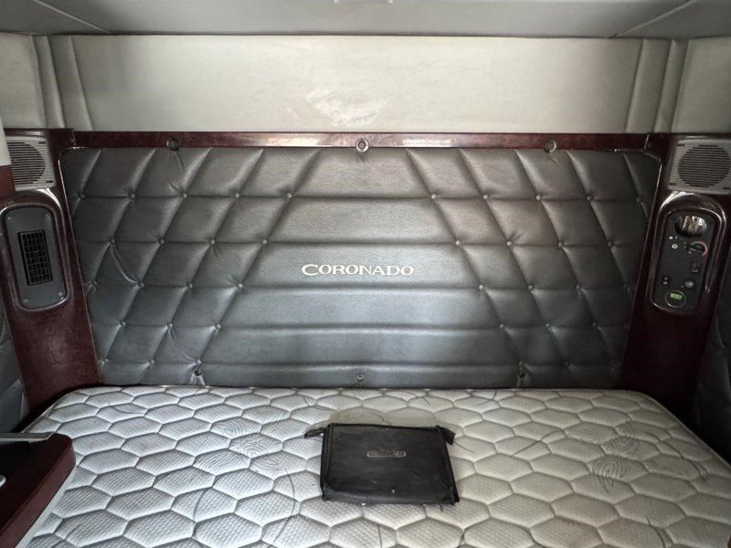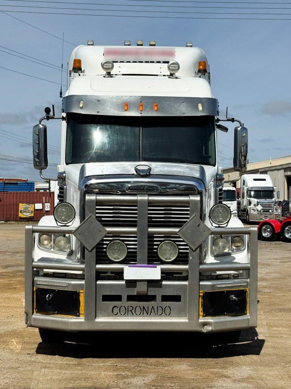 Tidy Freightliner Coronado with Detroit DD15 power, quad fuel tanks, Viesa cooler, and Road Train rating.