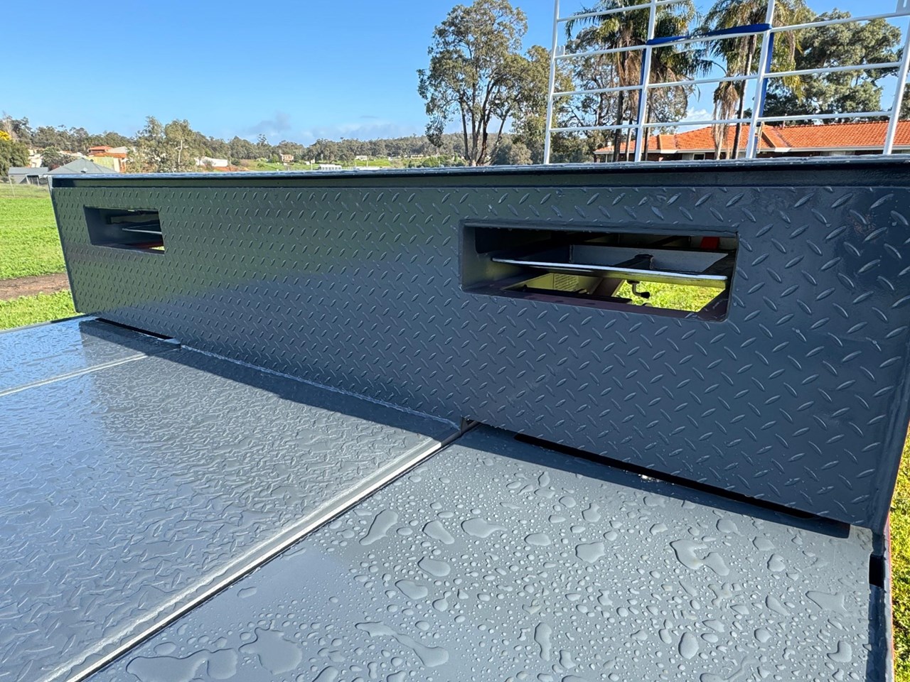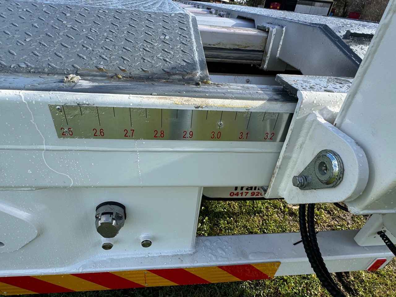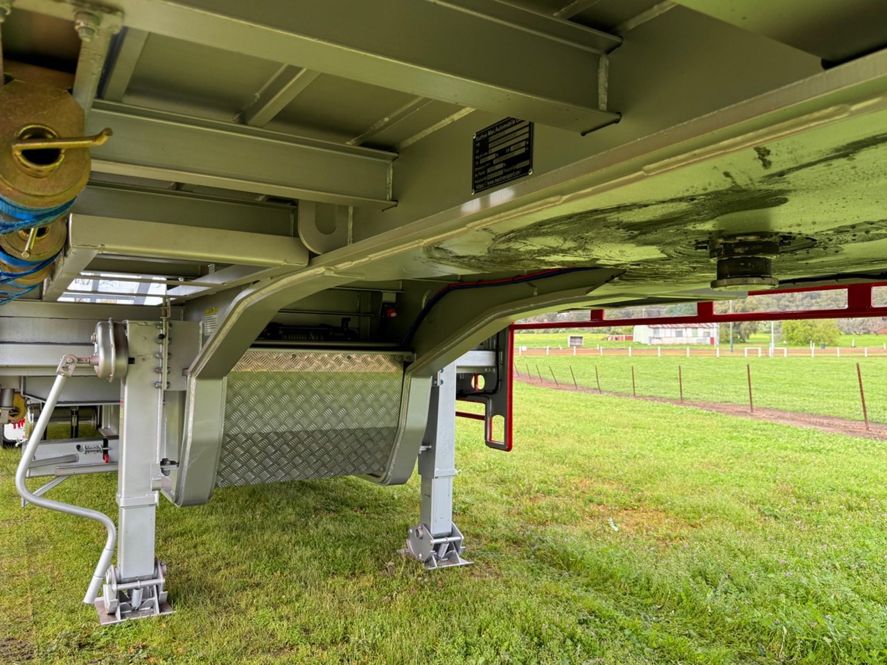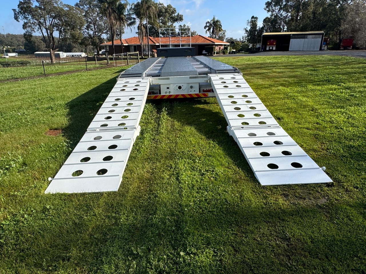 These trailers have the highest quality finishes with all the extras such as bifold ramps, sliding top deck ramps, with cordless remote, 3 way container pins with pedestals, multiple tie down points, road train bracket, 19.5 inch polished Alloy wheels, K hitch axles on KT250 airbag suspension with dump valve, WABCO EBS braking system, 4x tool boxes with stainless doors and water tank. Must see these trailers to appreciate the quality and finishes.