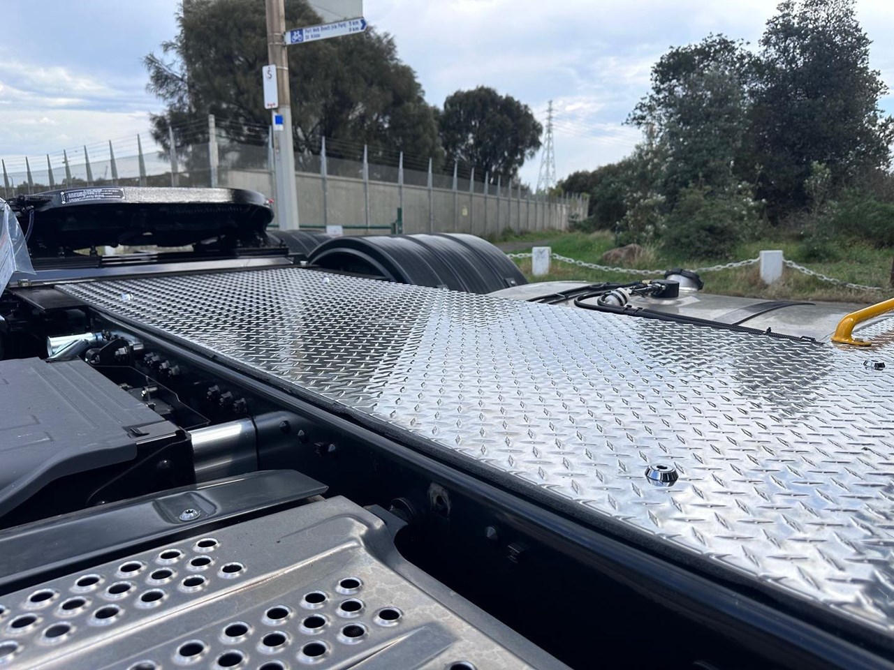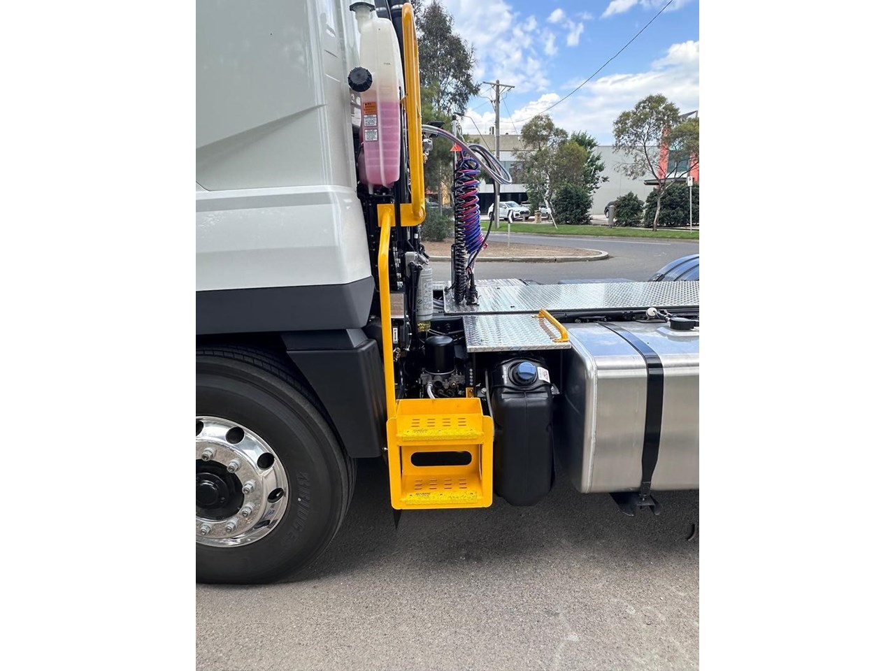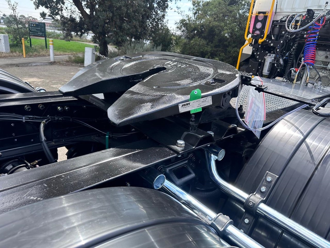 The Prime Mover set up is done in-house at an Authorised Fuso Dealer. The Build up includes a Jost Fixed Turn Table, Plastic rear guards, Pogo stick with Air brake fittings and ABS and Light control connectors. Aluminum walk plate OHS safe steps to gain access to the chassis.