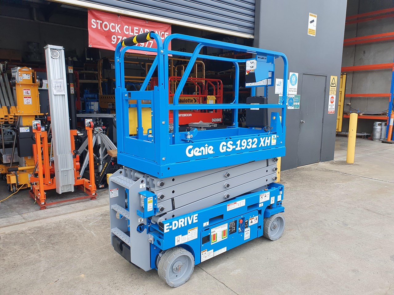 The Genie GS1932 is a self propelled scissor lift that is designed for safely raising you up on flat level concrete surfaces. It is only 81cm wide and only 2m high, this makes this machine compact enough to fit through some doorways while allowing for a maximum raised deck height of 5.79m.