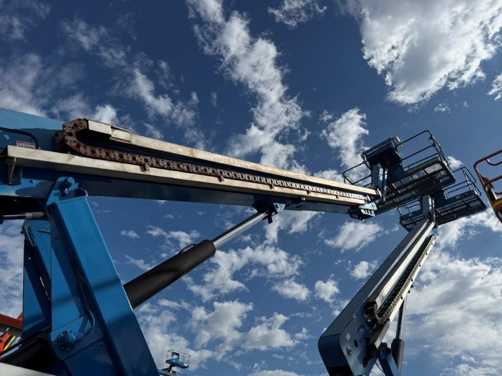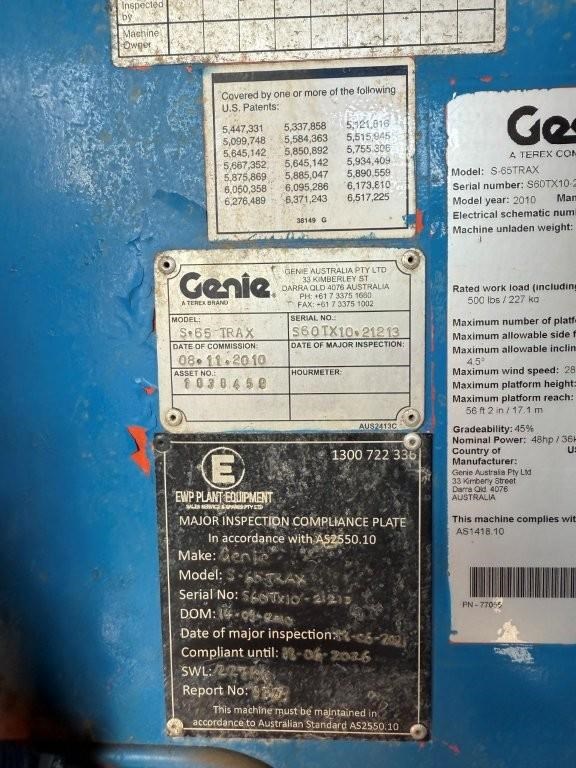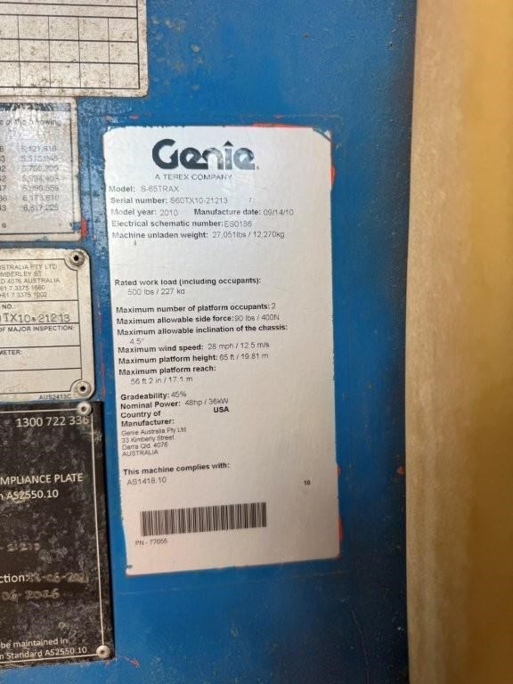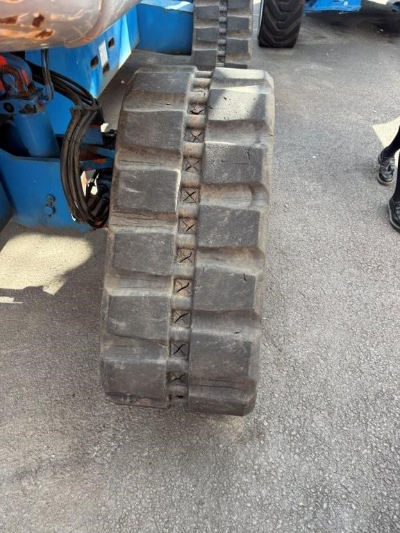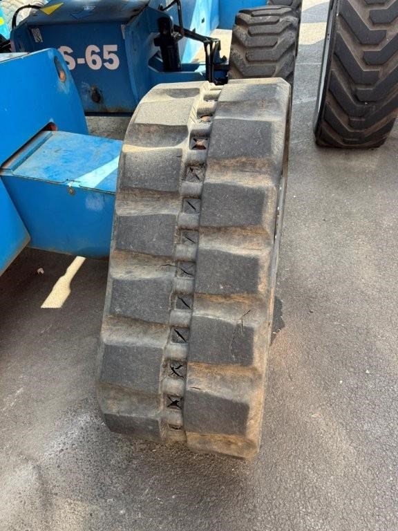 The 2010 Genie S-65 Trax is a telescopic boom lift designed for rough terrain, featuring four independent, triangular tracks instead of wheels for enhanced traction and gradeability. It offers a maximum working height of about 21.8 meters (65 feet), a 1.52-meter (5-foot) articulating jib for precise positioning, and a 160-degree hydraulic platform rotation. Its fixed, four-point track system provides stability and allows it to operate year-round in varying conditions.