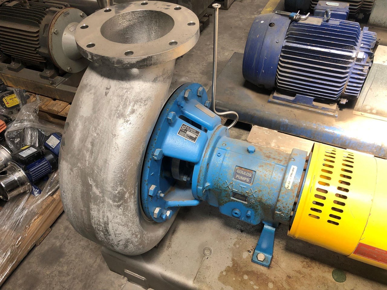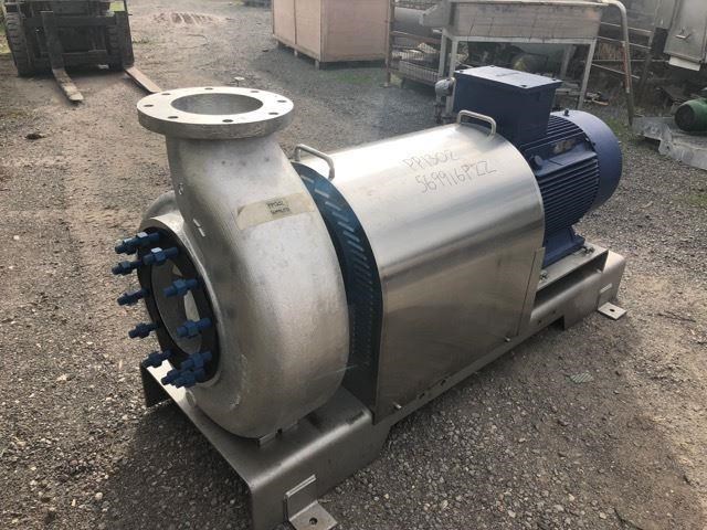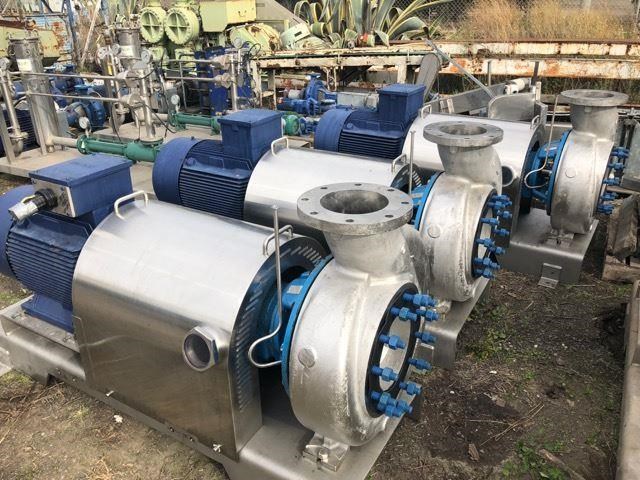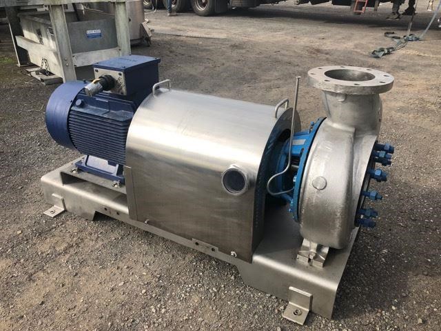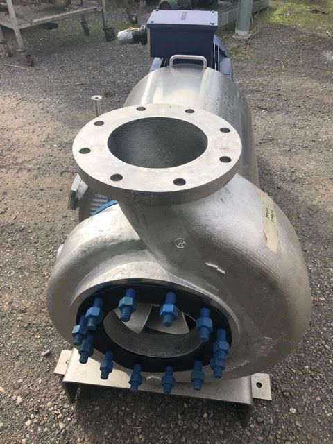 Stainless steel fully open impeller pump(approx 320mm dia), 316SS, with 75kw Siemens 4pole electric motor. Inlet 10inch. Outlet 8 inch Capacity up to 1700m3/hr 30m head. Ideally suited for corrosives and abrasives, handles solids and stringy fibres with ease. Allows for simple restoration of clearances when wear takes place. Back pump-out vanes reduce pressure on the shaft seal, reduce axial thrust on bearings. The pumps have little or no wear internally, there are 4 available. Excellent Condition.