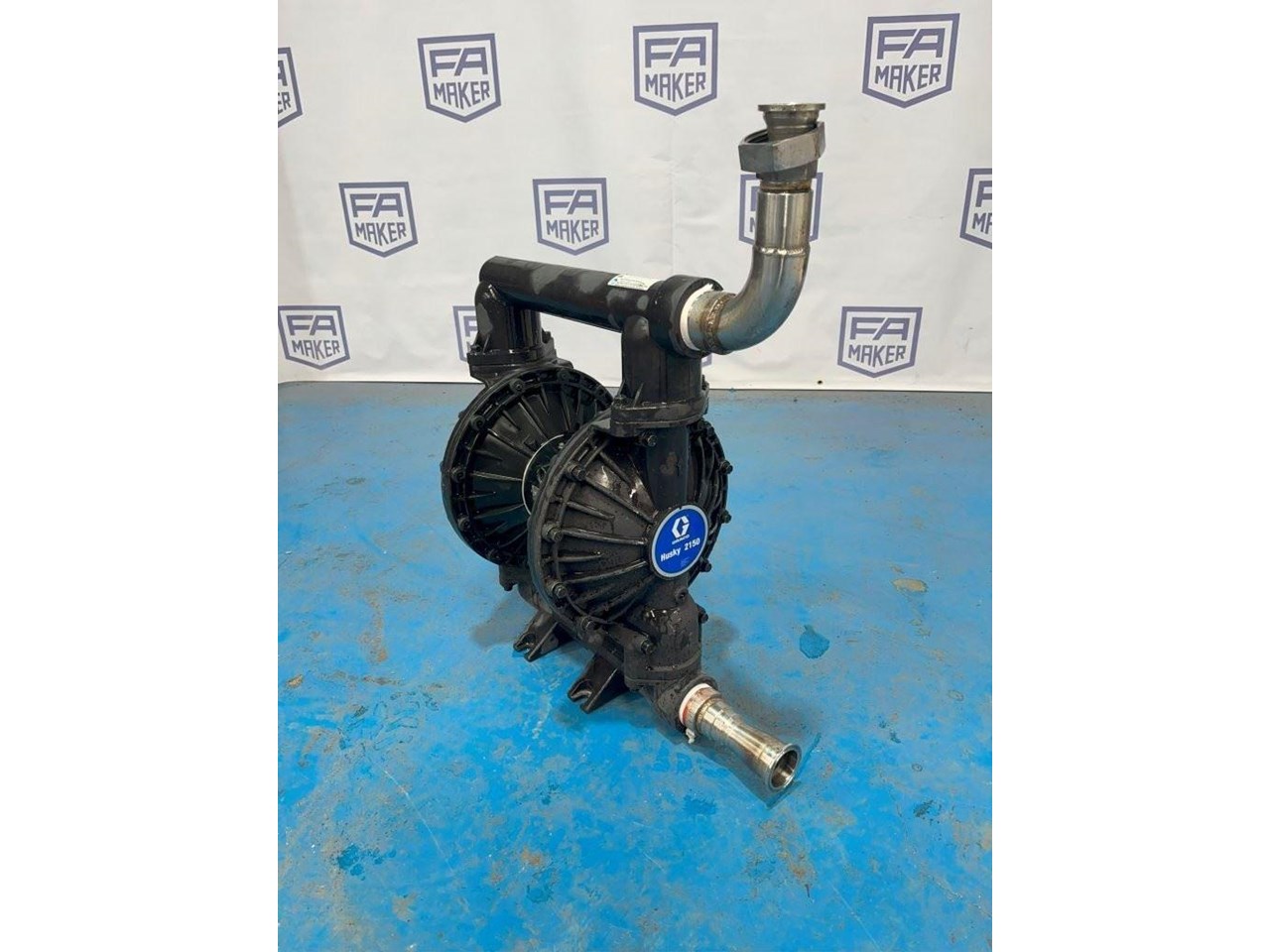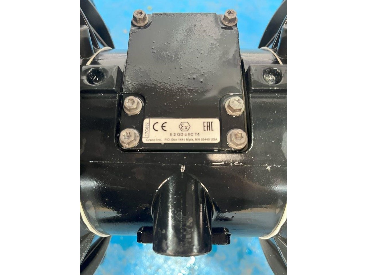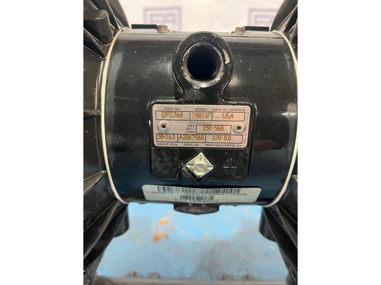 Graco - Husky 2150 Diaphragm Pump. ATEX Rating: Ex II 2 GD c IIC T4 Part No: DFC366 Series: 26B16F 2 Inch suction / discharge. Flow: Up to 586 l/min Fluid pressure: Up to 120 PSI / 8 BAR Unit runs well. The Husky 2150 air operated diaphragm pump features a stall-free low pulsation air valve, which provides a smooth and rapid changeover. Overall improved efficiency (up to 40% more efficient) Highest fluid flow rate in its class Up to 5 times longer diaphragm life compared to other air operated diaphragm pumps Expanded material offering to handle endless applications Fewer parts than industry peers, the air valve is externally accessible so it can be serviced quickly and easily without un-installing the diaphragm pump 51 mm (2 in.) ANSI end-porting Fluid flow up to 568 lpm (150 gpm) Fluid pressure to 8.4 bar (0.84 MPa, 120 psi) Lube-free operation Epoxy-coated air section for tough environmental conditions
